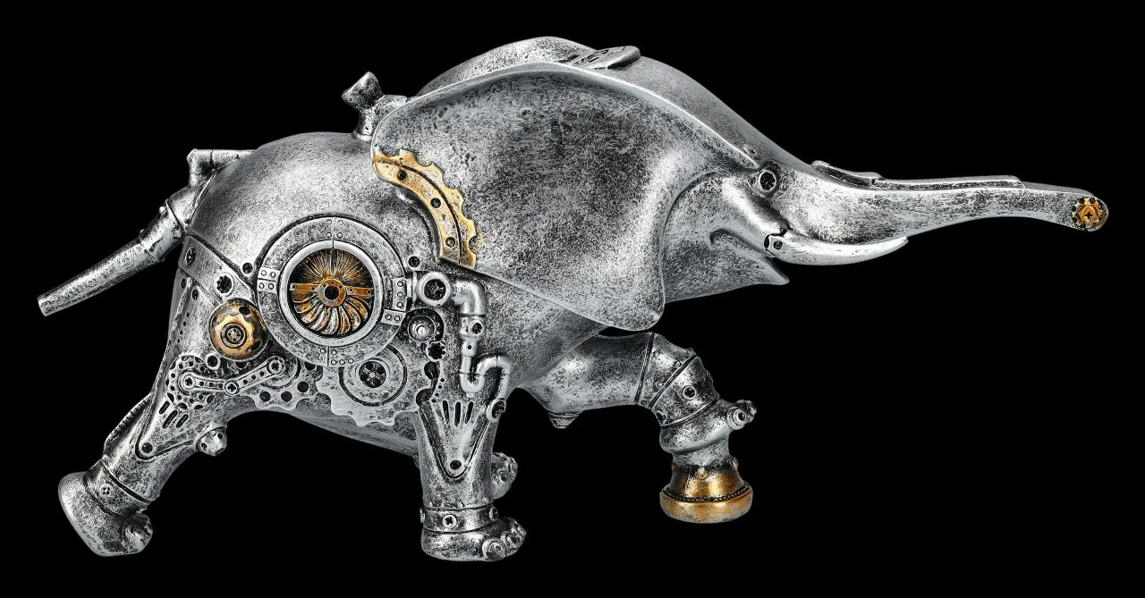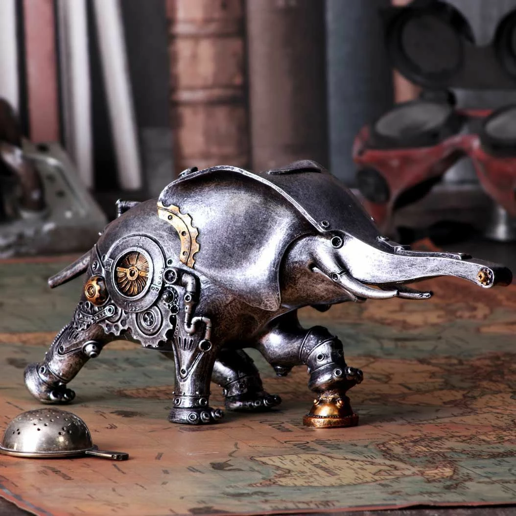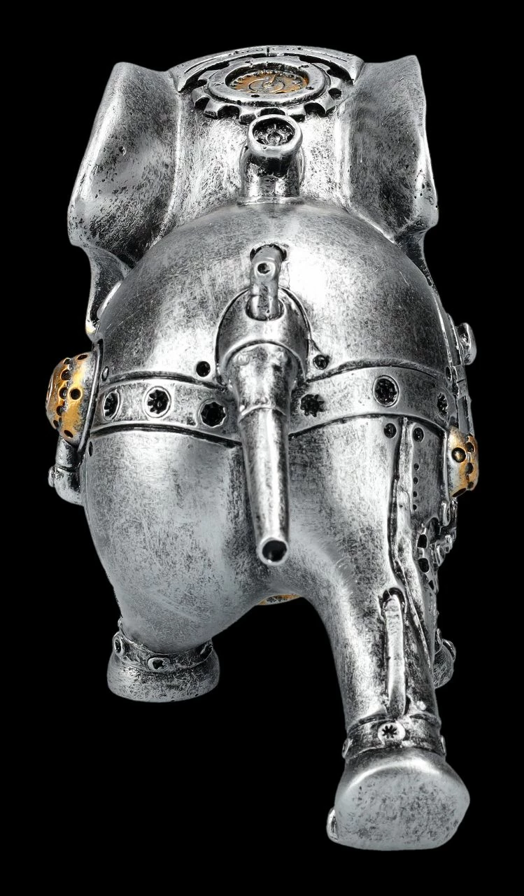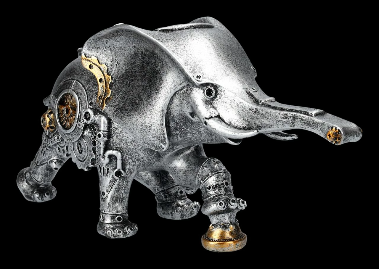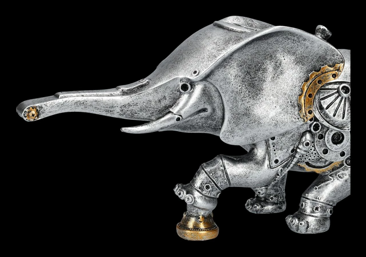 Als würden ihn die Räder antreiben, ist er mit flotten Schritten unterwegs, der außergewöhnliche Steampunk Mechanical Mammal. Der faszinierende Elefant aus handbemaltem Kunststein (Polyresin) wirkt wie aus verschiedenen Metallen und technischen Rädern angefertigt. Mit der Höhe von 14 cm, der Breite von 31 cm und der Tiefe von 10 cm ist er eine sehr interessante Deko und ein toller Blickfang.