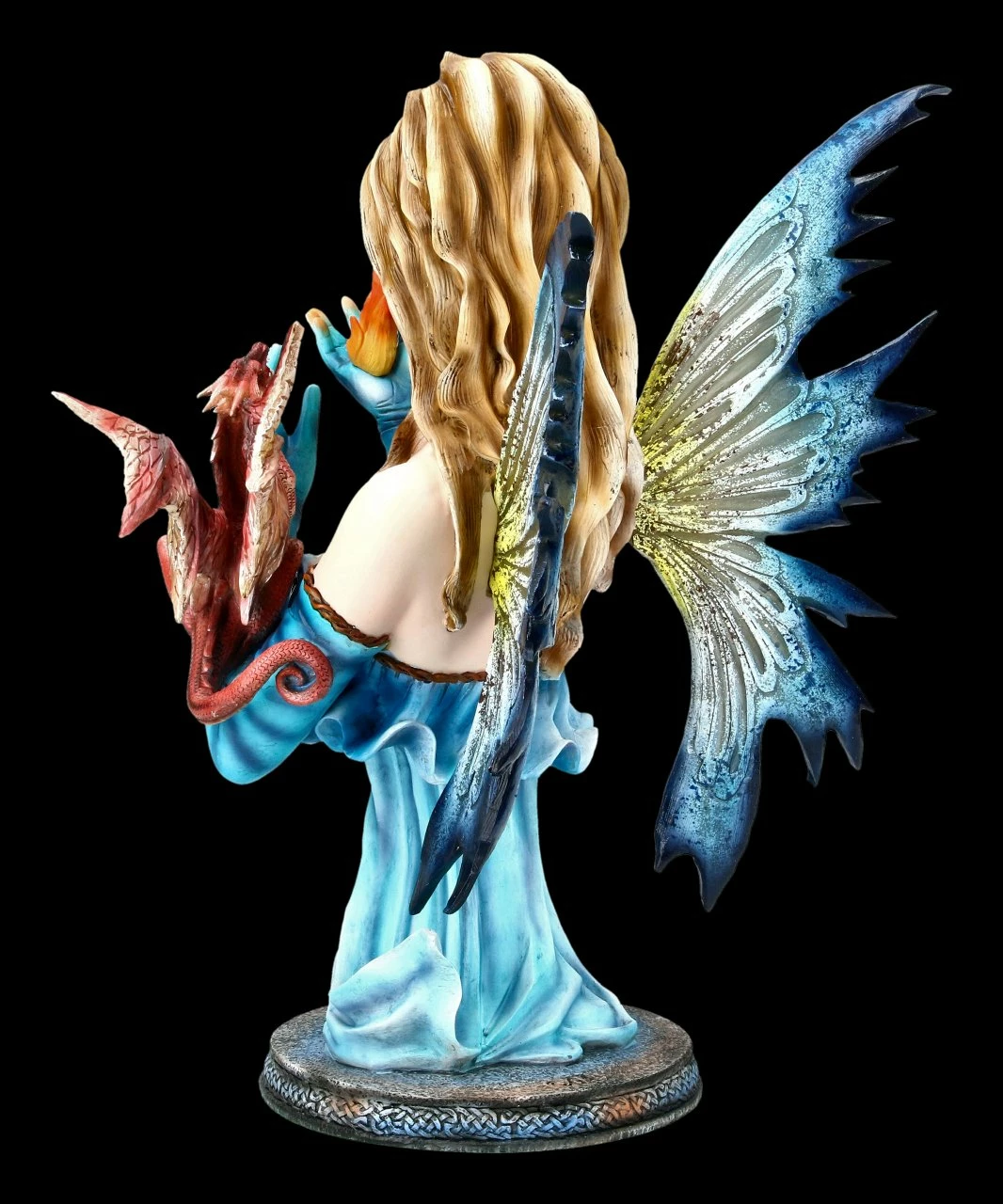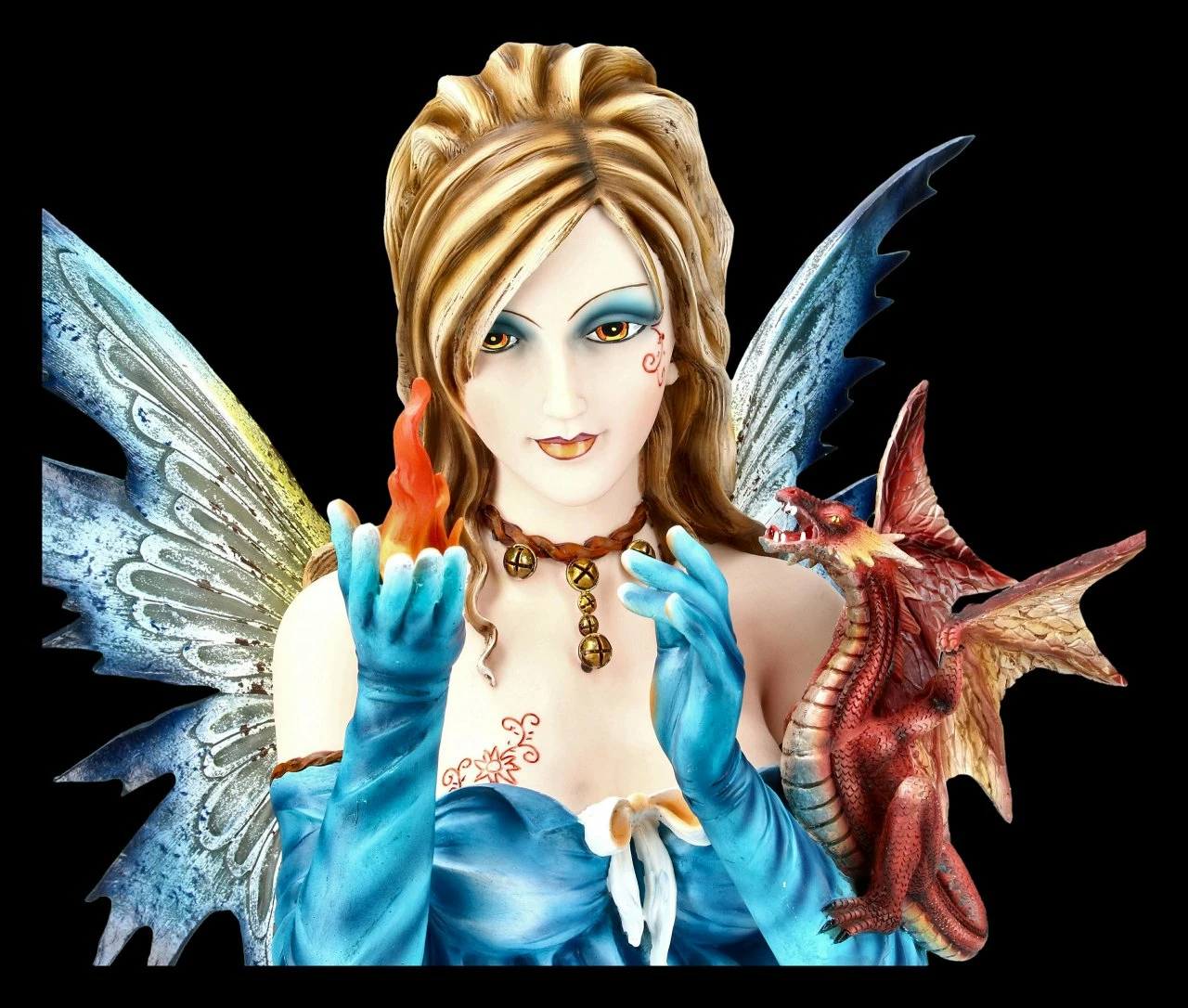 Ist diese Feen Büste nicht wunderschön? In ihrer einen Hand lässt sie ihr Element, das Feuer, hell brennen und in ihrer anderen hält sie einen kleinen Feuerdrachen. Durch die feine und detaillierte Machart mit der zarten und gelungenen Farbgebung wirkt die Fee beinahe lebendig. Schauen Sie sich doch nur ihr zartes Gesicht und ihr wunderbares Kleid an. Soviele kleine Details laden den Betrachter zum Staunen ein.