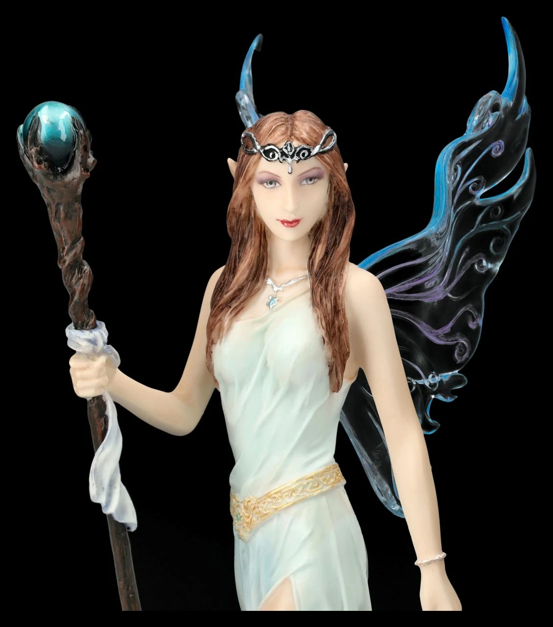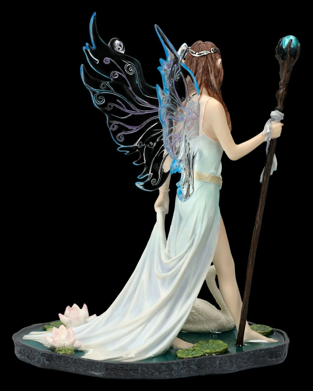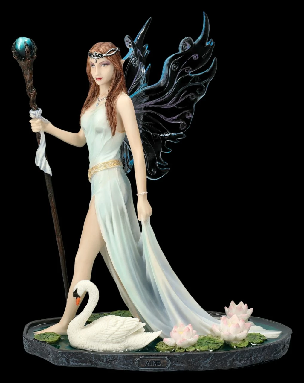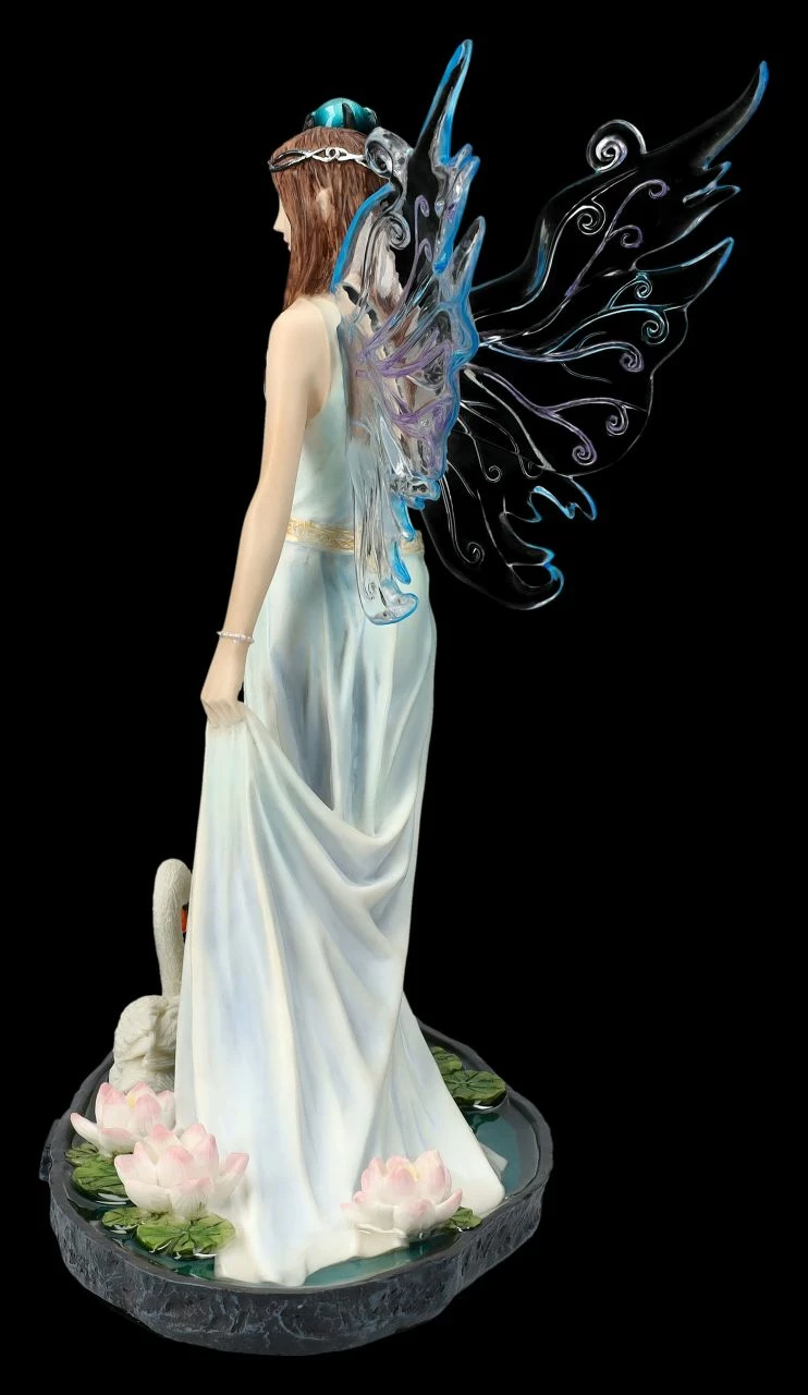 Den Zauberstab in ihrer rechten Hand, gleitet mit großen Schritten Aine, die Feenkönigin des Sommers, über einen mit rosa Seerosen bewachsenen Teich. Neben ihr schwimmt ein stolzer Schwan. Ihr langes, wie feiner Wassernebel aussehendes Kleid hält sie mit einer Hand fest, damit es nicht nass wird. Die langen rötlich-braunen Haare der Feenkönigin werden von einem Diadem gehalten. Bis zu den wunderbar zarten und filigranen Flügeln ist die Feenkönigin des Sommers aus der Studio Collection von Veronese einfach wunderschön anzusehen. Die 23 cm hohe, 18 cm breite und 14 cm tiefe Elfen-Figur aus Kunststein (Polyresin) wurde in zarten Tönen sehr liebevoll von Hand bemalt. Jeder, der von der geheimnisvollen Welt der Elfen und Feen fasziniert ist, wird von der kunstvollen Elfe bezaubert sein. Aine, die Feenkönigin des Sommers mit Zauberstab und Schwan ist aber auch ein zauberhaftes Geschenk für alle Elfen-Sammler.