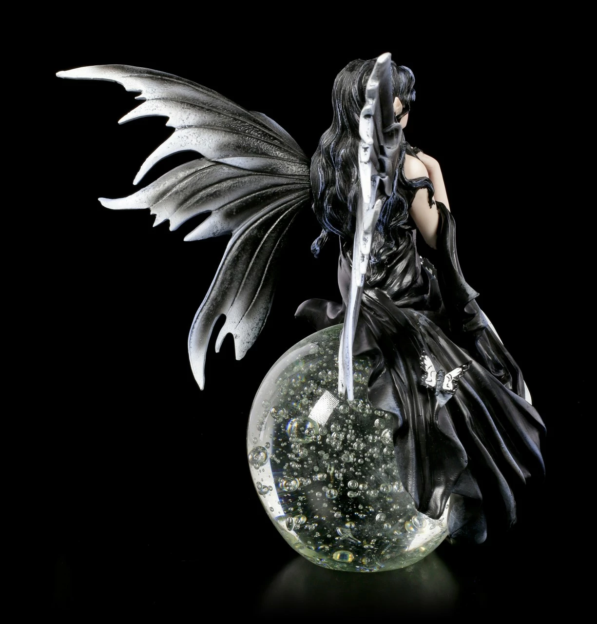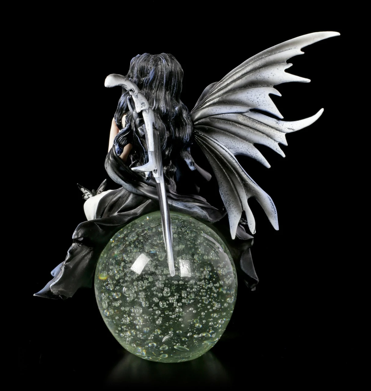 Gathering Storm, die wunderhübsche dunkle Elfe, sitzt auf der magischen Kugel, welche die Zukunft beinhaltet. Die Stirn der eleganten Elfe ist mit einem blauen Schmuckstein verziert. Sie trägt ein aufwändiges schwarz-weißes Kleid und ein Schmetterling hat sich auf ihrem Knie niedergelassen. Die Figur der Elfe auf der Glaskugel wurde von der Künstlerin Nene Thomas aus handbemaltem Kunststein (Polyresin) und Glas gestaltet. Sie wird in einer Geschenkverpackung geliefert und ist ein tolles Geschenk an einen Sammler.