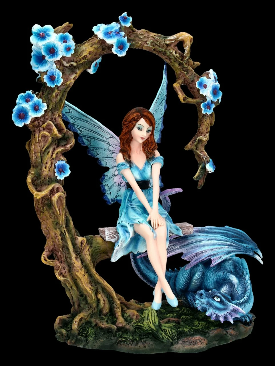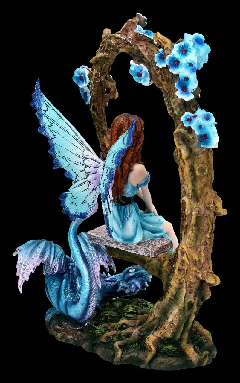Auf der Schaukel in dem alten Blauregen-Bogen sitzt schüchten und verträumt eine süße kleine Elfe. Ein blauer Drache schaut erwartungsvoll zu ihr hoch. Die wunderschöne Elfe auf der Schaukel aus der Serie Dream Eden ist 27 cm hoch, 21 cm breit und 16 cm tief. Sie ist wunderbar detailreich aus Kunststein (Polyresin) gefertigt und bis zu den zarten Flügeln mit viel Liebe zum Detail handbemalt. Die Flügel sind zum Stecken. Die blauen Blüten, die zarten Blautöne im Kleidchen und auf den Flügeln und der blaue Drache geben der Szene ein verträumt mystisches Aussehen. Die schöne Elfe mit dem blauen Drachen ist ein wunderbares Geschenk, über das sich jeder Elfen- und Drachenfreund freuen wird.