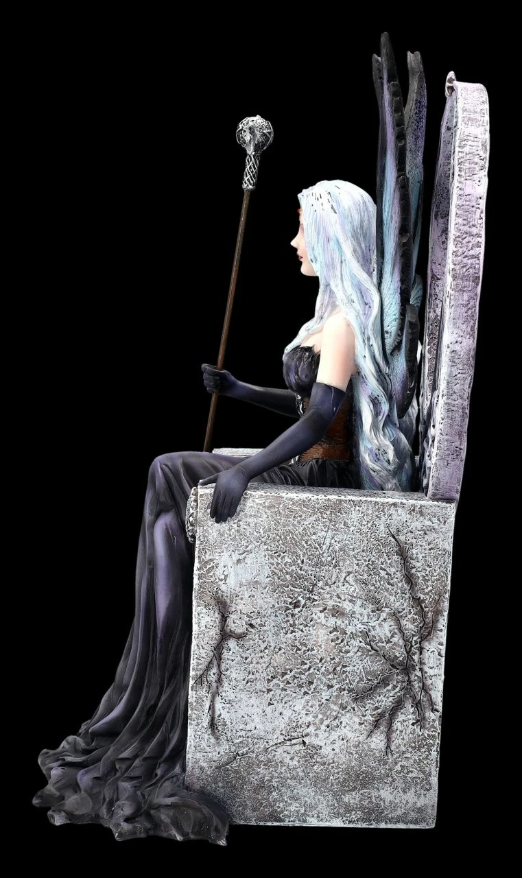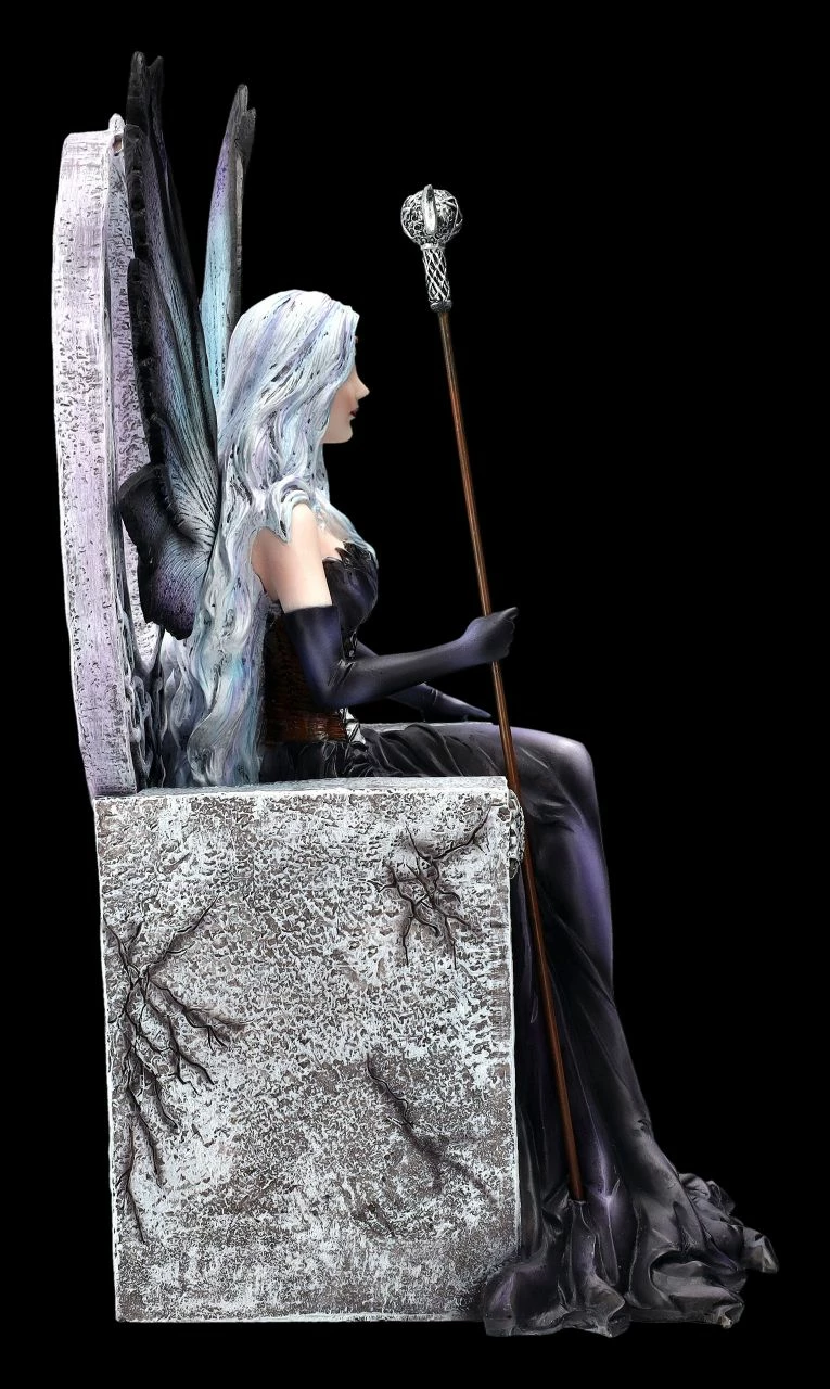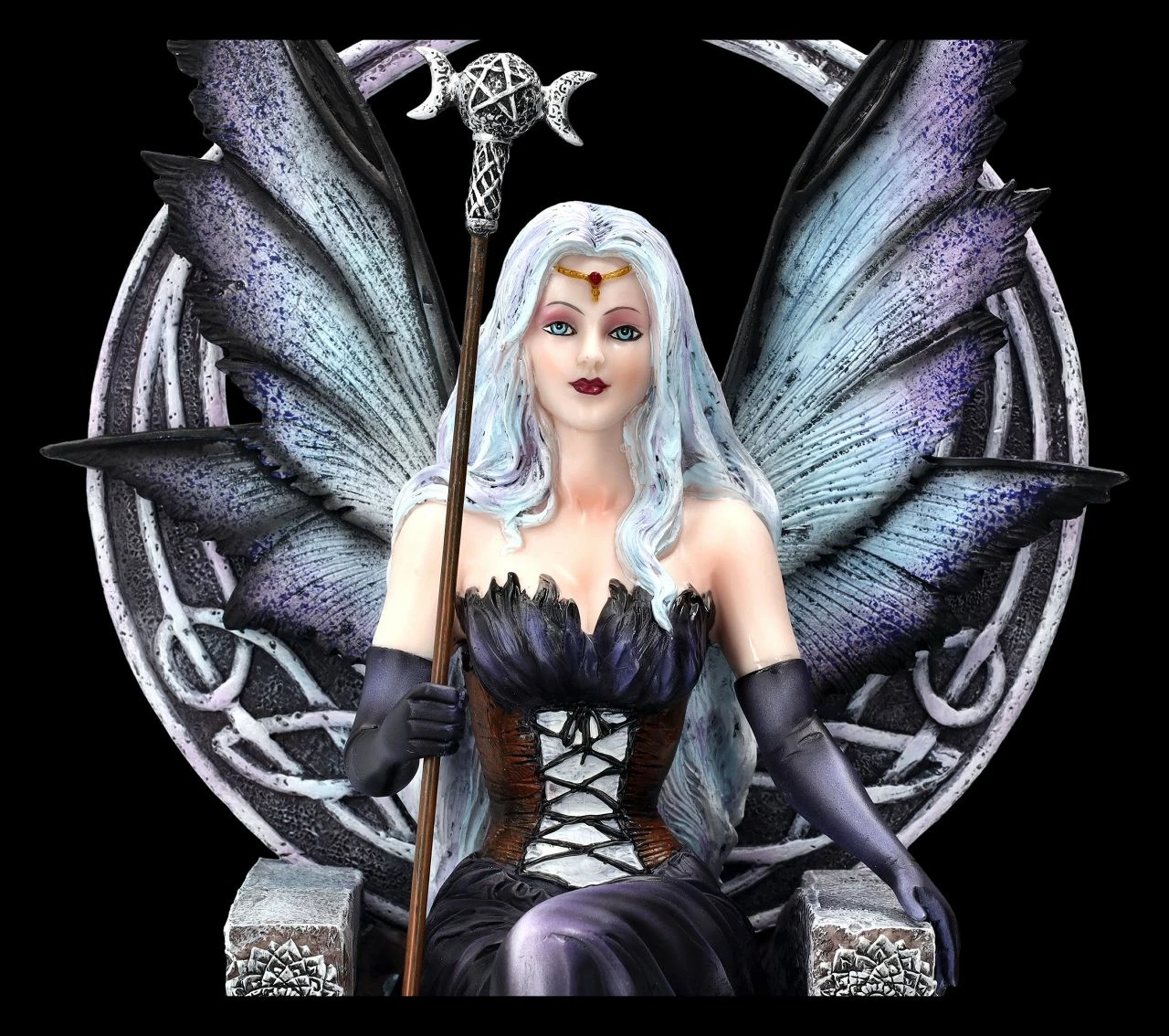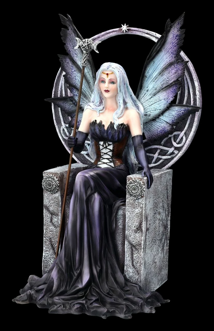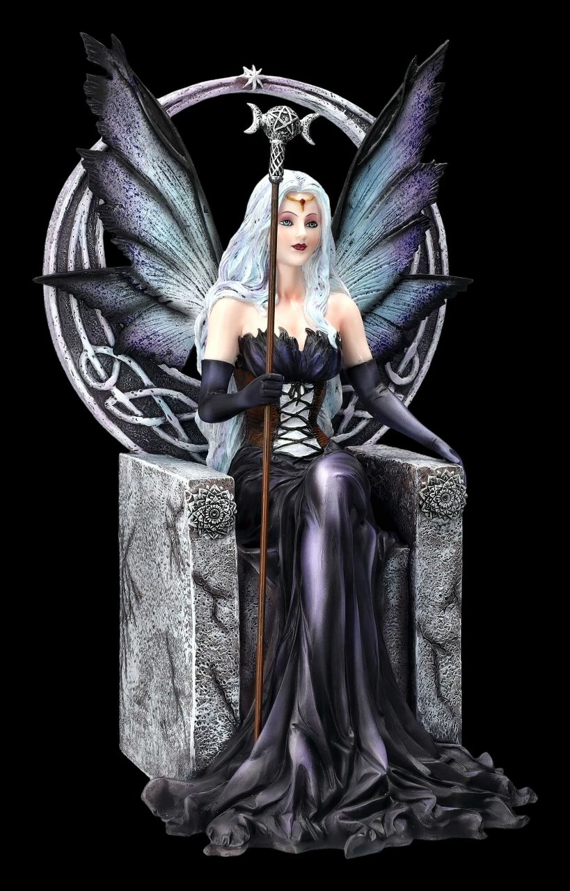 Einmal im Jahr kommt die Königin der Magier zu jedem ihrer Elfenvölker und hält Audienz. Denn auch im Elfenreich, tief in den dunklen Wäldern der Fantasie, gibt es immer wieder Probleme, die gelöst werden müssen. Es soll schließlich Glück und Frieden im Elfenreich herrschen, dann können.alle märchenhaften Wesen des Waldes zufrieden sein. In ihrem nachtblauen Kleid mit den Rabenfedern, die den Ausschnitt schmücken und wie Spitzen aus ihrem Mieder hervorschauen, hat die geheimnisvolle Elfe auf ihrem Thron Platz genommen. Ihr 28 cm langes, 3 cm breites und 1 cm tiefes Zepter mit dem Wicca Symbol des Dreifachmondes, der die naturverbundene Spiritualität demonstriert, zeigt an, dass sie weise und allen wohlgesonnen ist. Auch die Rücklehne ihres steinernen Throns wird von zwei Mondsicheln gebildet. Ihre schönen Flügel in den Farben eines Nachtfalters und das Zepter sind zum Stecken Die fantastische, 33 cm hohe, 18 cm breite und 18,5 cm tiefe Elfen-Figur Magic Monarch wurde aus liebevoll handbemaltem Kunststein (Polyresin) gefertigt und ist auch ein wunderbares Geschenk für jeden, der von der mystischen und magischen Welt der Elfen begeistert ist.