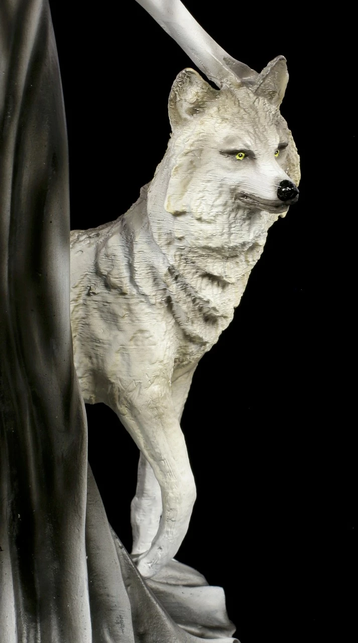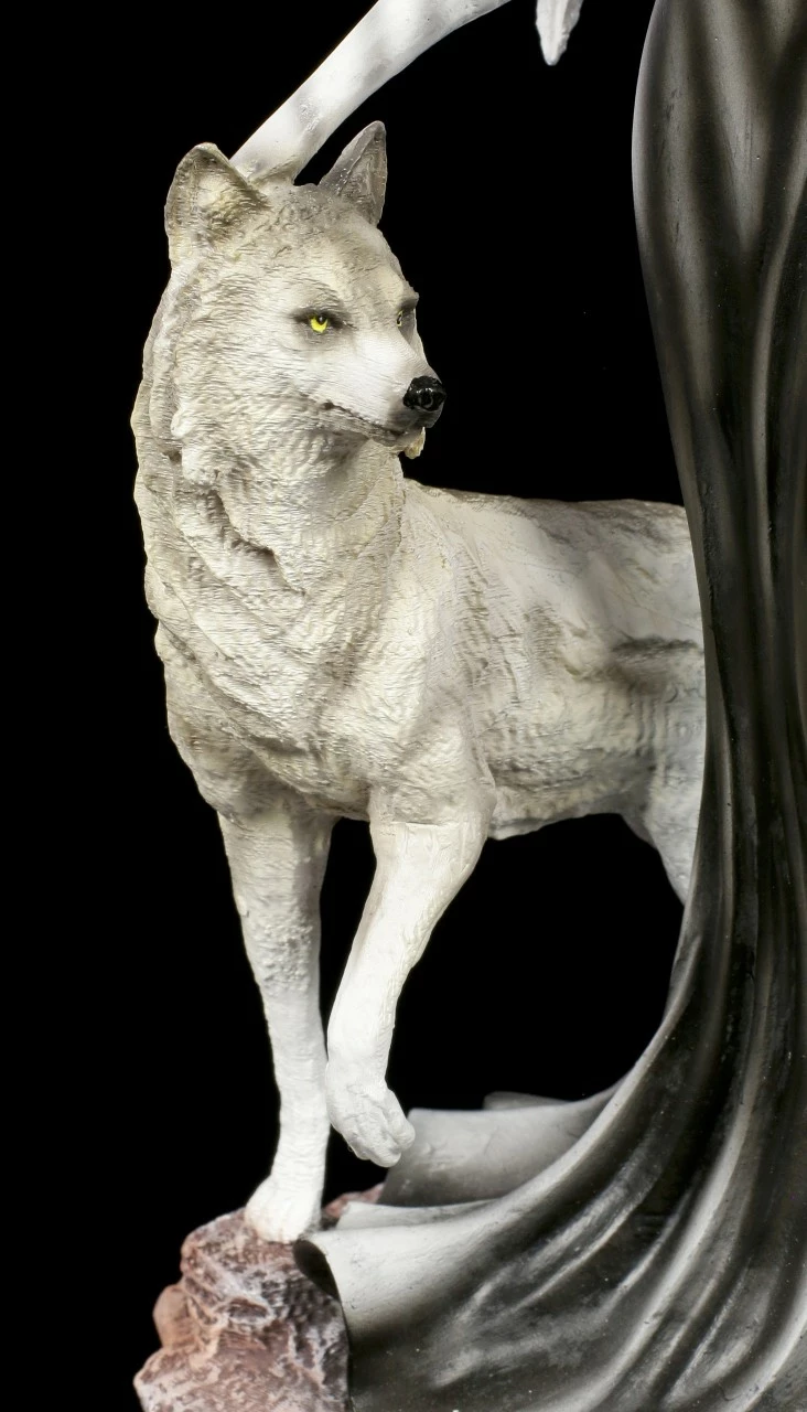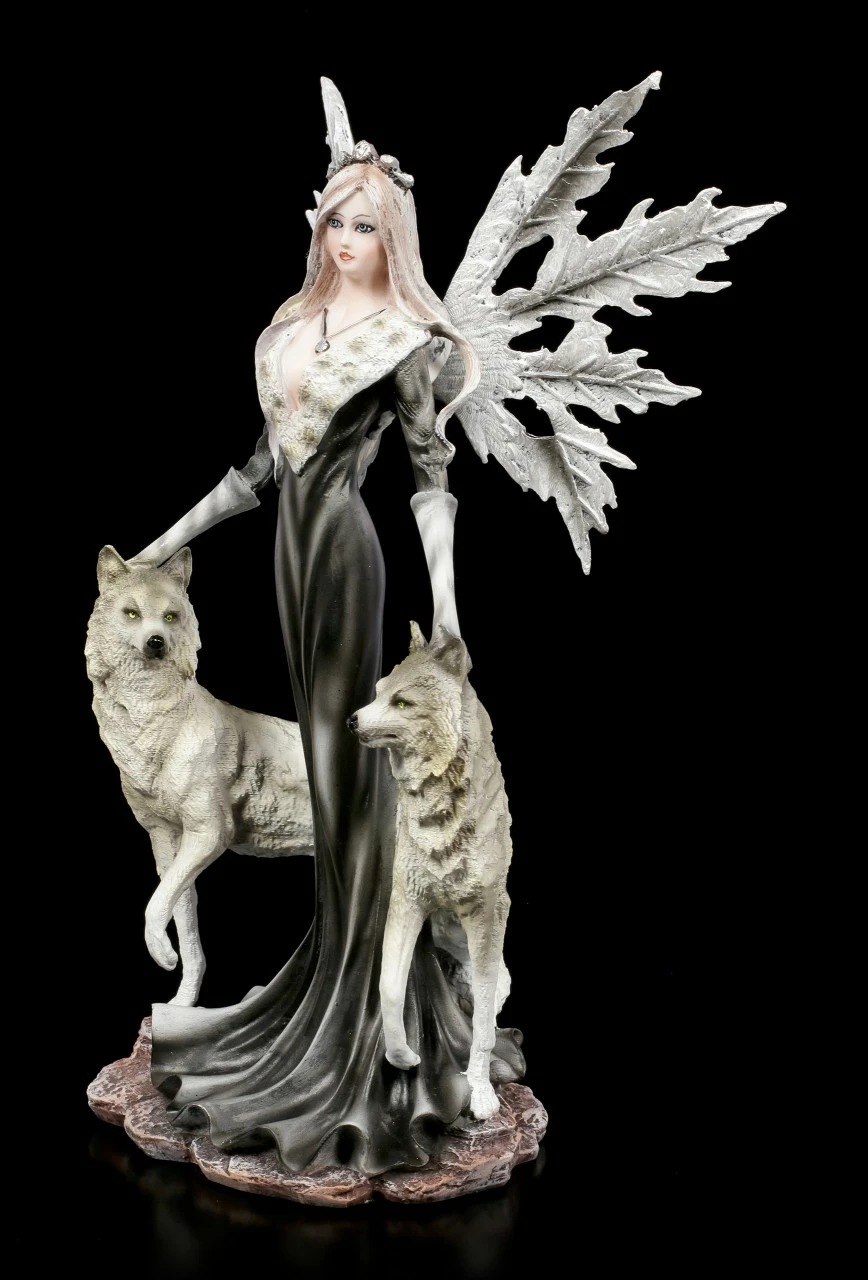 Die Dark Fairy ist auf dem Weg zu ihrem Elfenvolk. Sie wird begleitet von ihren zwei grauen Wölfen. Ihr schwarzes Kleid mit dem weißen Kragen passt perfekt zu ihren grauen Flügeln und hüllt die anmutige Elfe in eine mystische Aura. Die faszinierende Elfen Figur wurde liebevoll aus handbemaltem Kunsstein (Polyresin) gefertigt und fügt sich perfekt in eine Elfensammlung ein.