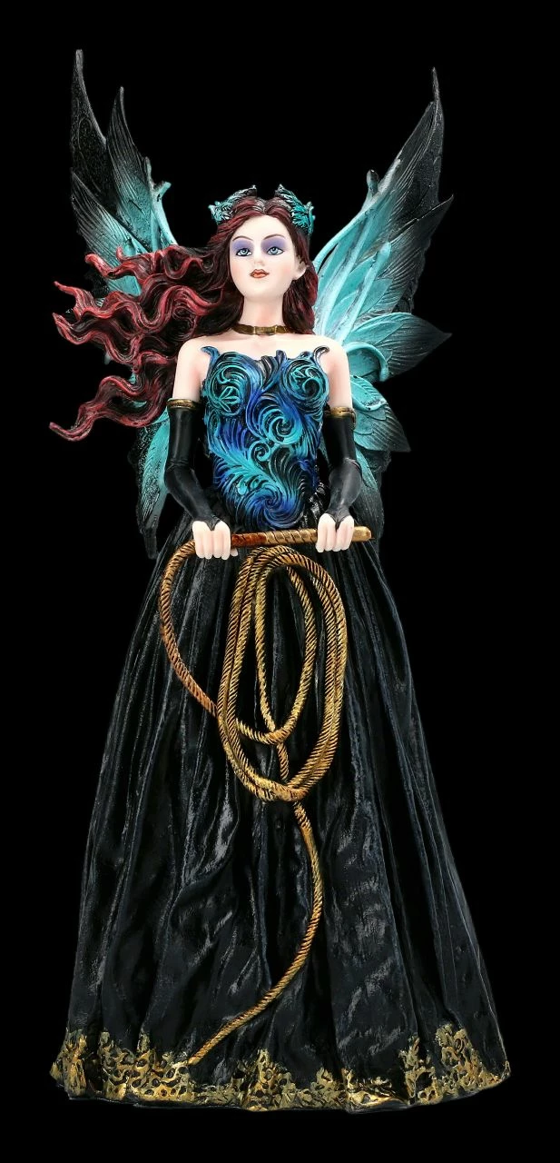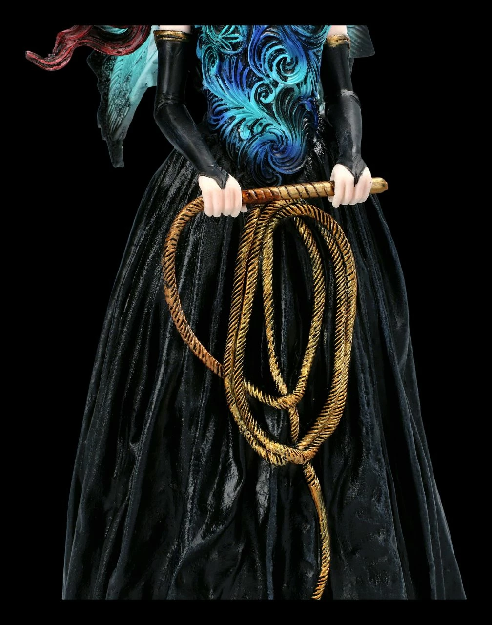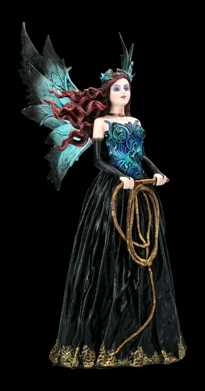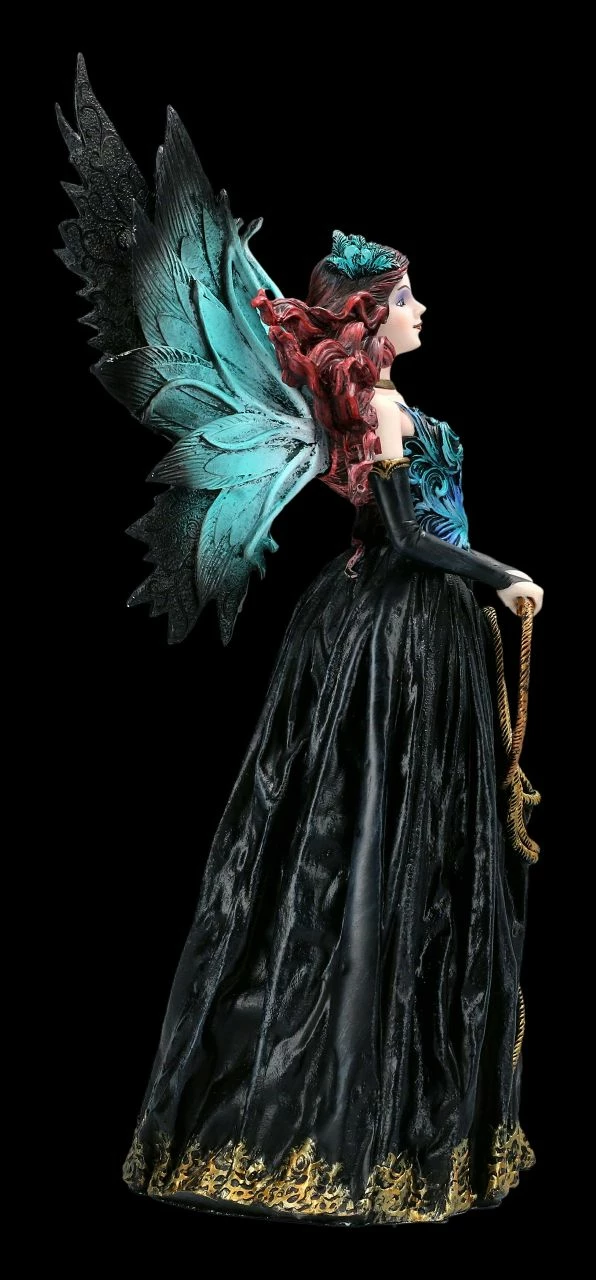 Wunderschön mit ihren langen roten Haaren und dem selbstbewussten Blick, steht die Dunkelelfe Juna da und hält in den Händen mit den langen schwarzen Handschuhen eine goldene Peitsche. Nur wer mutig genug ist und den Saum ihres Kleides mit dem schwarzen Rock mit goldener Bordüre und dem blauen, wie aus Pfauenfedern gefertigten Mieder berühren möchte, darf sich ihr nähern. Aus wunderschön handbemaltem Kunststein (Polyresin) gefertigt, hat die schöne Dunkelelfe Juna eine Höhe von 34 cm, eine Breite von 15,5 cm und eine Tiefe von 16 cm. Die Flügel sind zum Stecken. Die Schönheit ist ein besonderes Geschenk und eine außerordentlich dekorative Elfe.