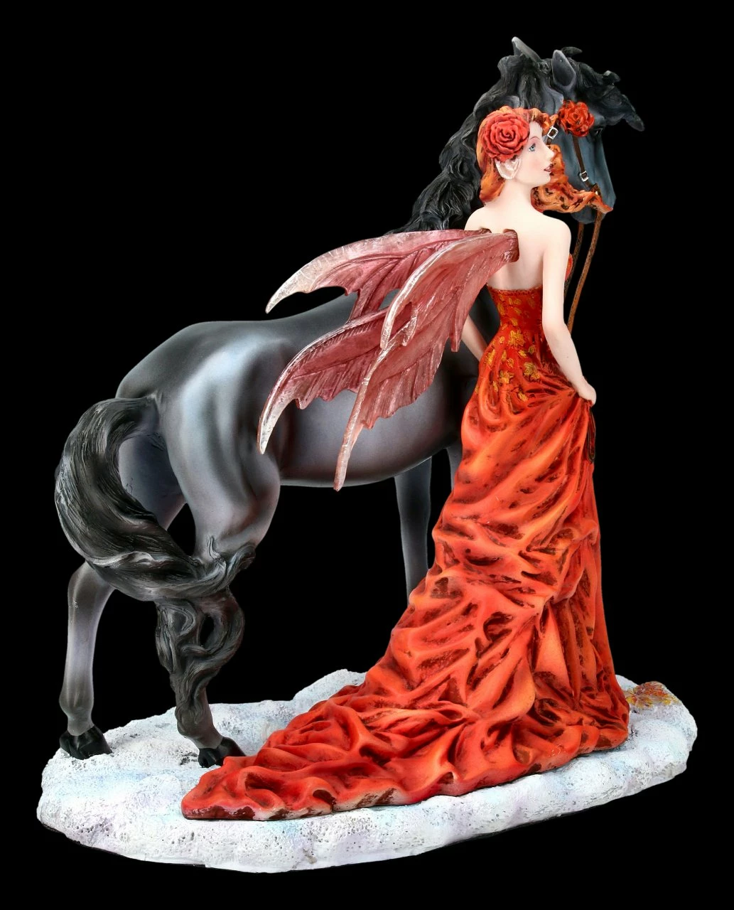 WOW! War der erste Eindruck vom Figuren Shop Team beim Anblick der umwerfenden Elfen Figur Echoes of Autumn von Nene Thomas. Die Elfe trägt ein atemberaubendes rotes Ballkleid und führt ihr nachtschwarzes Pferd am Zügel. Der Wind fährt den beiden einsamen Gestalten ins Haar und lässt die handbemalte Kunststein Figur lebendig wirken. Das Duo wird in einer edlen Geschenkbox geliefert.