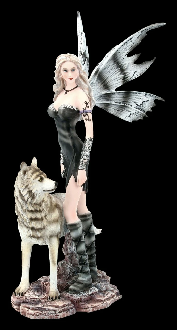 Die Nachtelfe Elleth wandert mit ihrem zahmen Wolf durch den nächtlichen Wald. Zu ihrem kurzen schwarzen Kleid trägt sie hohe geschnürte Stiefel. Elleth ist auf dem Weg zu einem geheimen Treffen mit ihren Freunden. Diese bezaubernde handbemalte Elfe aus Kunststein (Polyresin) ist der Blickpunkt in Ihrer Elfensammlung. Die Flügel der 27 cm hohen, 17 cm breiten und 11,5 cm tiefen fantastischen Elfen-Figur sind zum Stecken.