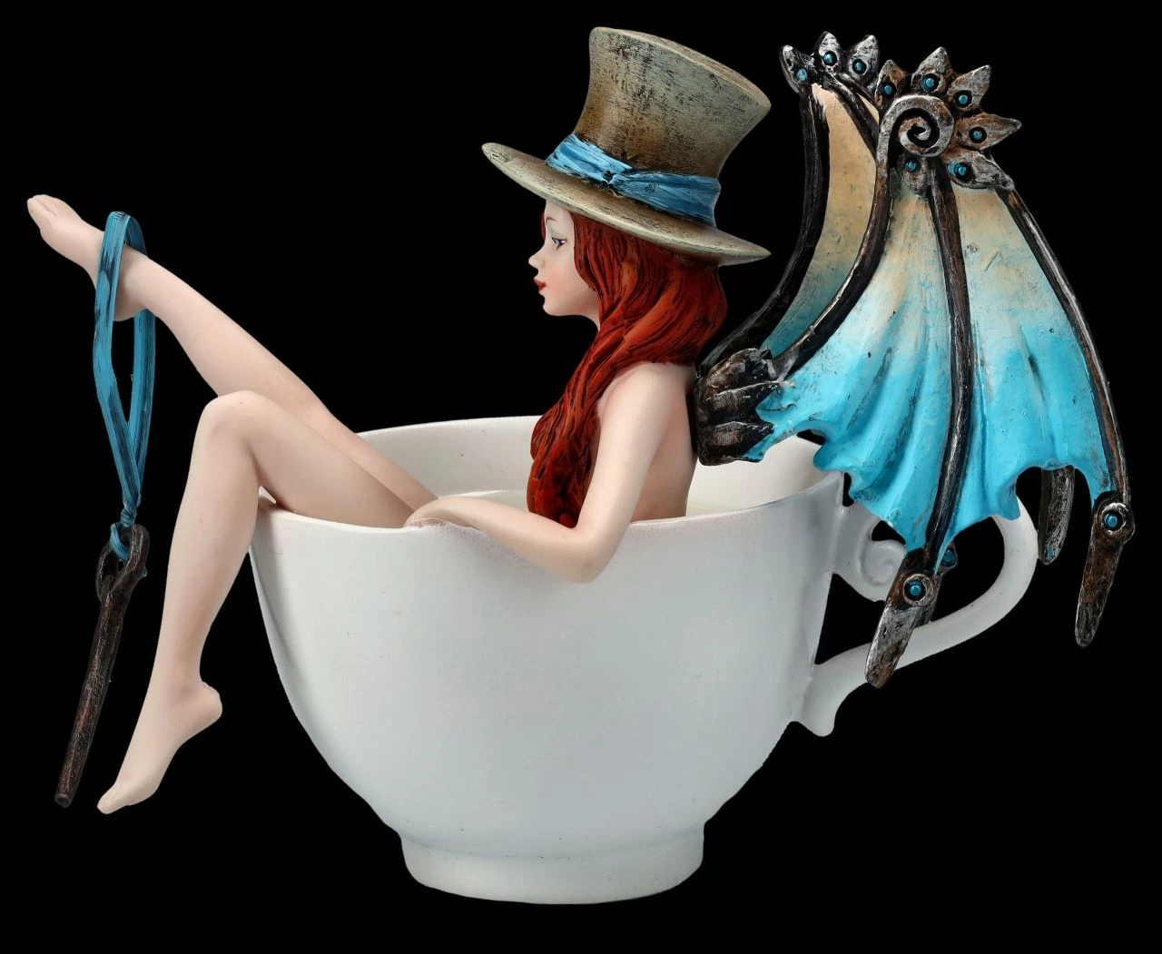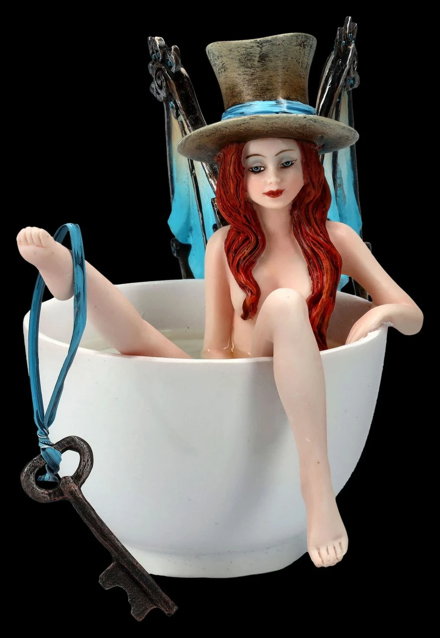 Darf die Person, die den Schlüssel zum Bad so wunderbar präsentiert bekommt, zur persönlichen Elfe in die Badewanne steigen? Nun, der Aufforderung sollte man sogar dann folgen, wenn das Steampunk-Bad so klein wie eine Tasse ist. Die witzige Elfe in der Tasse stammt von der großen amerikanischen Fantasy-Künstlerin Amy Brown. Die 11,5 cm hohe, 10 cm breite und 15 cm tiefe Elfen-Figur wurde detailreich aus Kunststein (Polyresin) gefertigt und liebevoll von Hand bemalt. Die Steampunk-Flügel der hübschen rothaarigen Elfe sind zum Stecken und der Badezimmerschlüssel an dem blauen Band ist zum Hängen. Diese lustige Elfen-Figur ist nicht nur ein schöner Blickfang in jedem Bad, sie ist auch als Aufforderung für ein gemeinsames Bad das perfekte Geschenk.