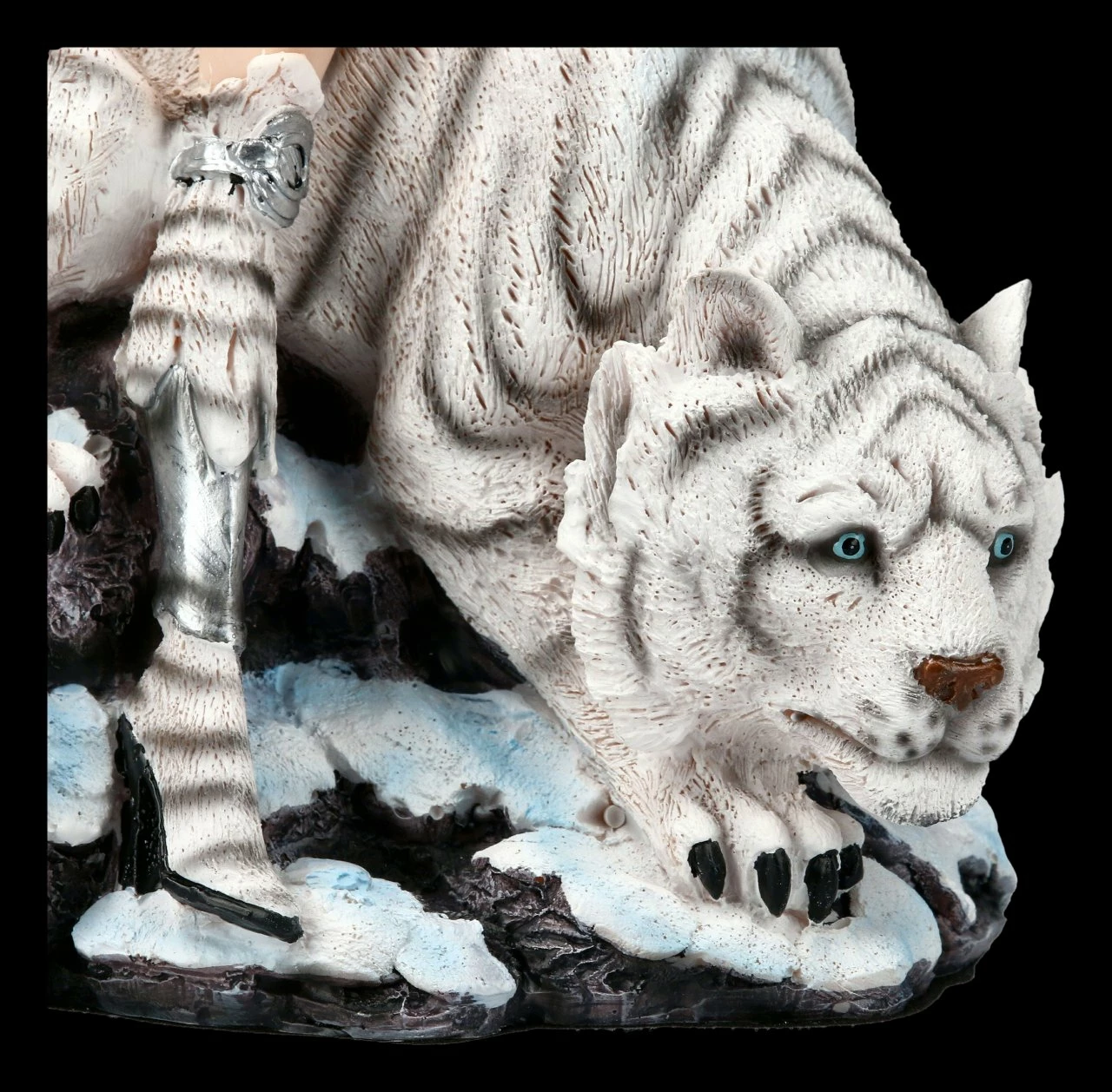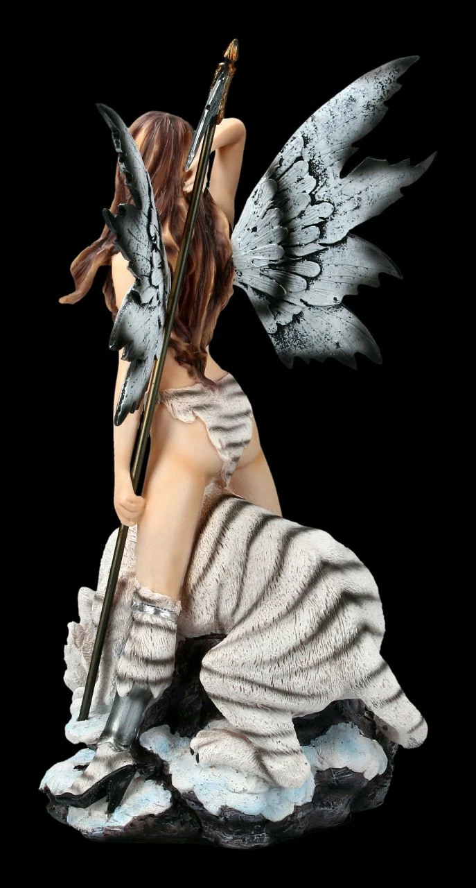 Wer stellt sich nicht manchmal vor, wie diese wunderschöne Elfen Kriegerin wilde Abenteuer zu bestehen. Lediglich mit einem metallenen Brustpanzer geschützt und mit einem Lendenschurz und Gamaschen aus Tigerfell bekleidet, reitet die leidenschaftliche schöne Kriegerin auf ihrem weißen Tiger und hält bereits ihre Hände an der 32 cm langen und 8 cm breiten Sense, die sie auf ihrem Rücken trägt. Eine eindrucksvolle und erotische Elfen Figur, die sehr detailreich aus Kunststein (Polyresin) gefertigt wurde und bis zum zarten Hautton, dem faszinierenden Gesichtsausdruck, dem langen braunen Haar, der Bekleidung und den metallicfarbenen Flügeln (die Flügel sind zum Stecken) sehr fein von Hand bemalt ist. Die schöne Kriegerin mit weißem Tiger ist mit der Höhe von 36 cm, der Breite von 19,5 cm und der Tiefe von 20 cm eine sehr sinnliche Dekoration und auch ein wunderbares Geschenk.