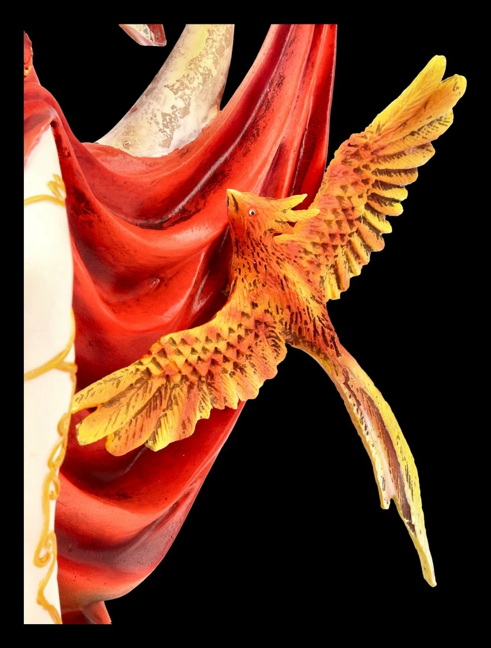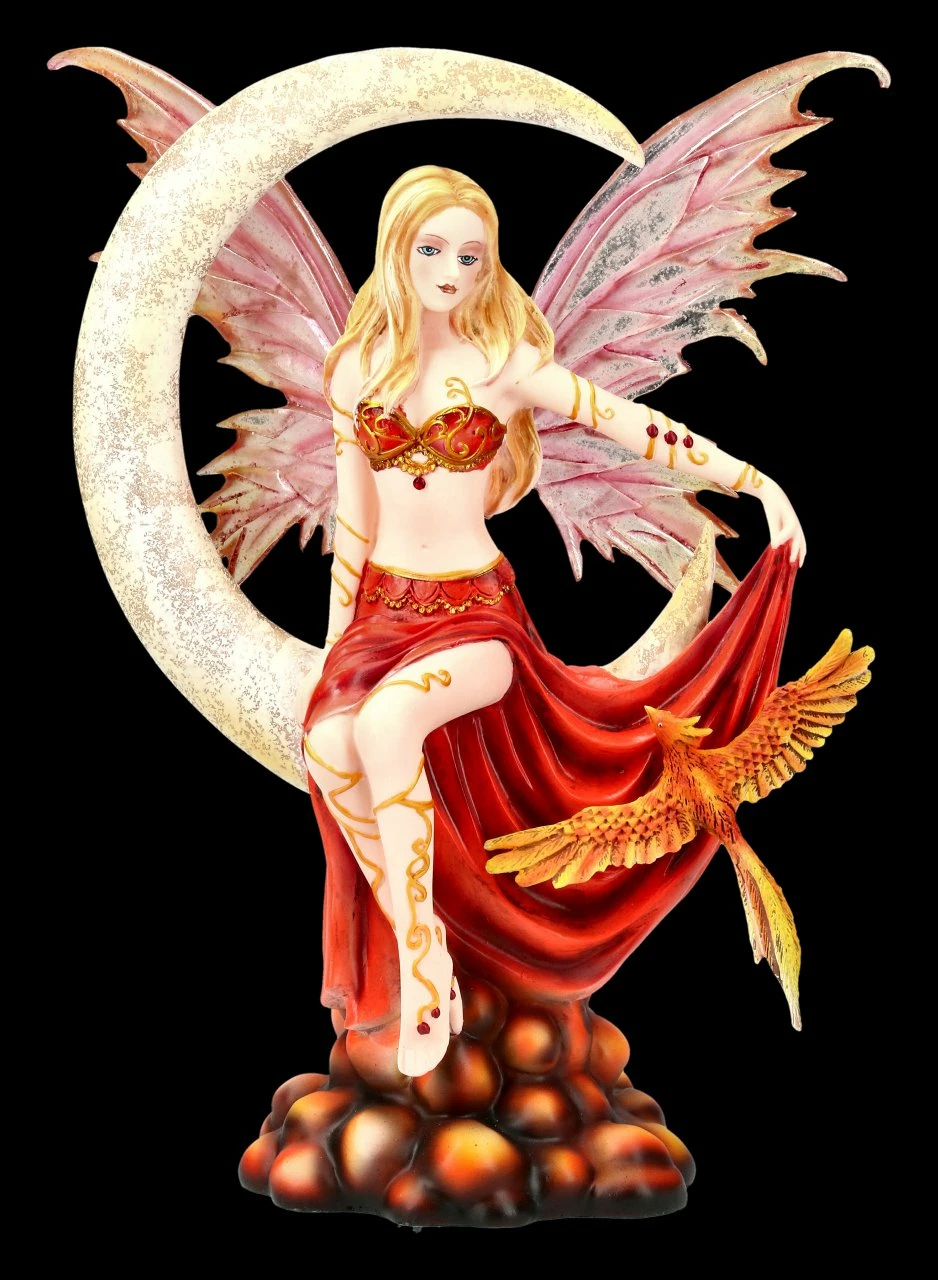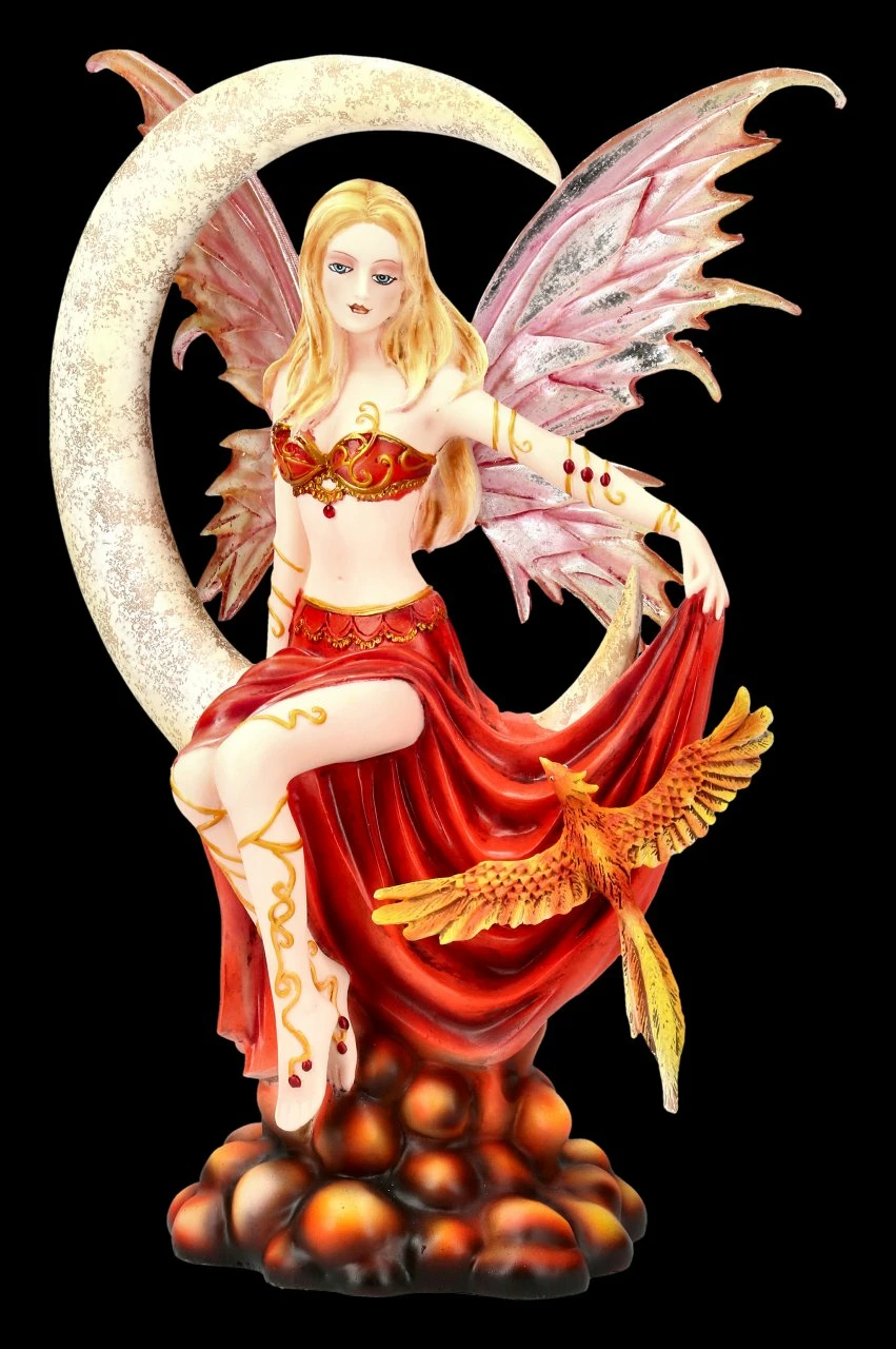 Die anmutige Elfe sitzt auf der Sichel des Mondes und freut sich über den Besuch des Phönix. Bestaunen Sie die vielen kleinen und liebevoll ausgearbeiteten Details der wunderschönen Fire Moon Elfe. Durch das gelungene Farbenspiel hebt sie sich aus einer Elfensammlung hervorragend hervor.