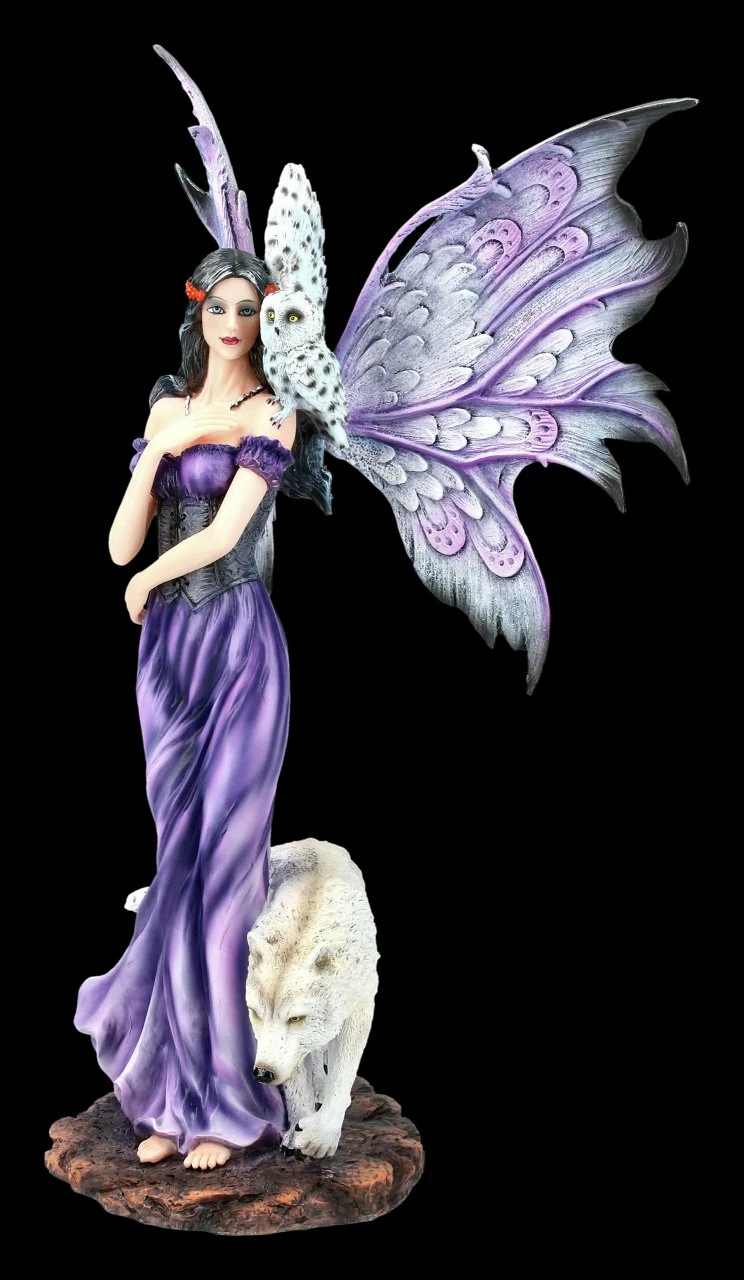Zärtlich wie eine Katze, streicht der weiße Wolf um die Beine der wunderschönen Elfe in dem beinahe durchsichtigen, Amethyst-farbenen, Kleid mit schwarzem Mieder. Auf der Schulter der schönen Elfe ist gerade eine weiße Eule gelandet. Die drei Waldwesen bilden eine magische Verbindung. Aus sehr detailliert und liebevoll handbemaltem Kunststein (Polyresin) gefertigt, freut sich jeder Elfensammler über dieses magische Dream-Team. Mit einer Höhe von 40 cm, einer Breite von 25,5 cm und eine Tiefe von 16 cm ist die schöne Figur sicher ein aufregender Blickpunkt in jedem Wohn- oder Arbeitsbereich. Die Flügel sind zum Stecken. Nicht nur für Elfenfreunde ist diese wunderschöne Elfe mit ihren magischen Begleitern ein wunderbares Geschenk.