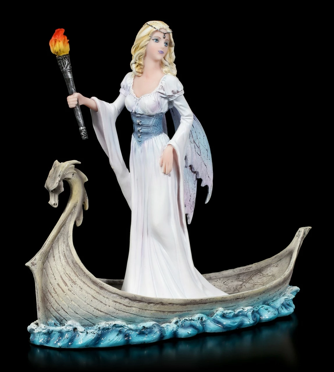 Mystica, die Elfen Magierin, ist auf einer wichtigen Mission. Sie will mit Hilfe des magischen Drachenboots und der niemals erlöschenden Fackel, ihren Liebsten finden. Dieser ist auf See verschollen. Die handbemalte Elfen Figur aus Kunststein wird Sie mit ihren vielen Details begeistern.