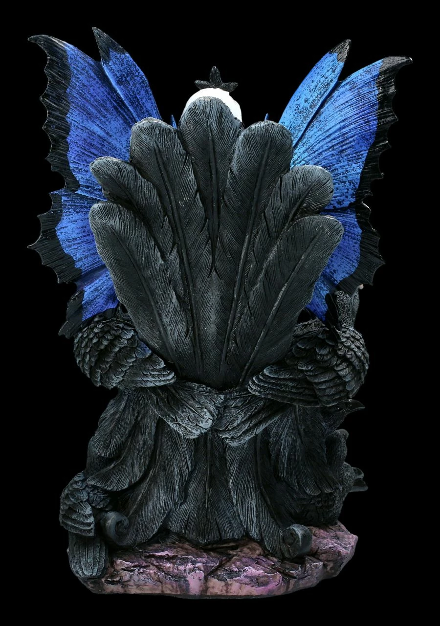 Stolz, in ein nachtblaues Kleid gehüllt, sitzt die Rabenkönigin auf ihrem Thron. An den beiden Seiten der beeindruckenden Rabenkönigin sitzen ihre Gefährten, auf die sie sanft ihre Hände legt. Zu ihren Füßen sitzen die jungen Raben. Hinter den zart gemusterten blauen Flügeln der schönen Elfe ist das Rabengefieder zu sehen. Die Rabenkönigin ist ausserordentlich detailreich aus sorgfältig handbemaltem Kunststein (Polyresin) gefertigt. Sie ist 29,0 cm hoch, 17,0 cm breit und 20,0 cm tief. Die kunstvoll gemalten Flügel der Elfe sind zum Stecken.