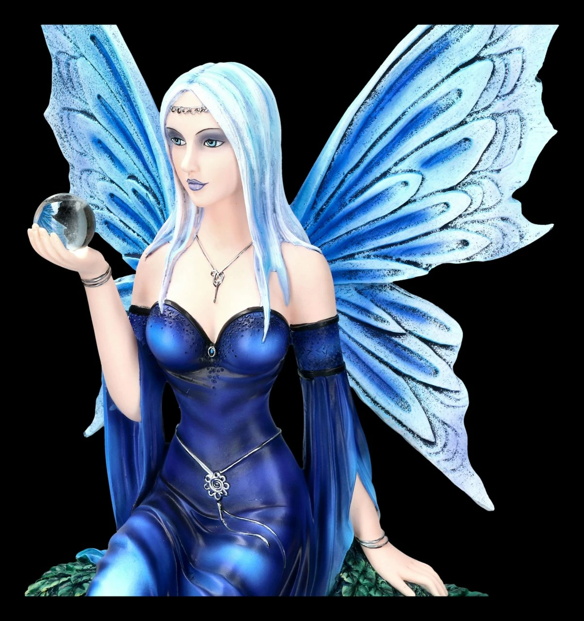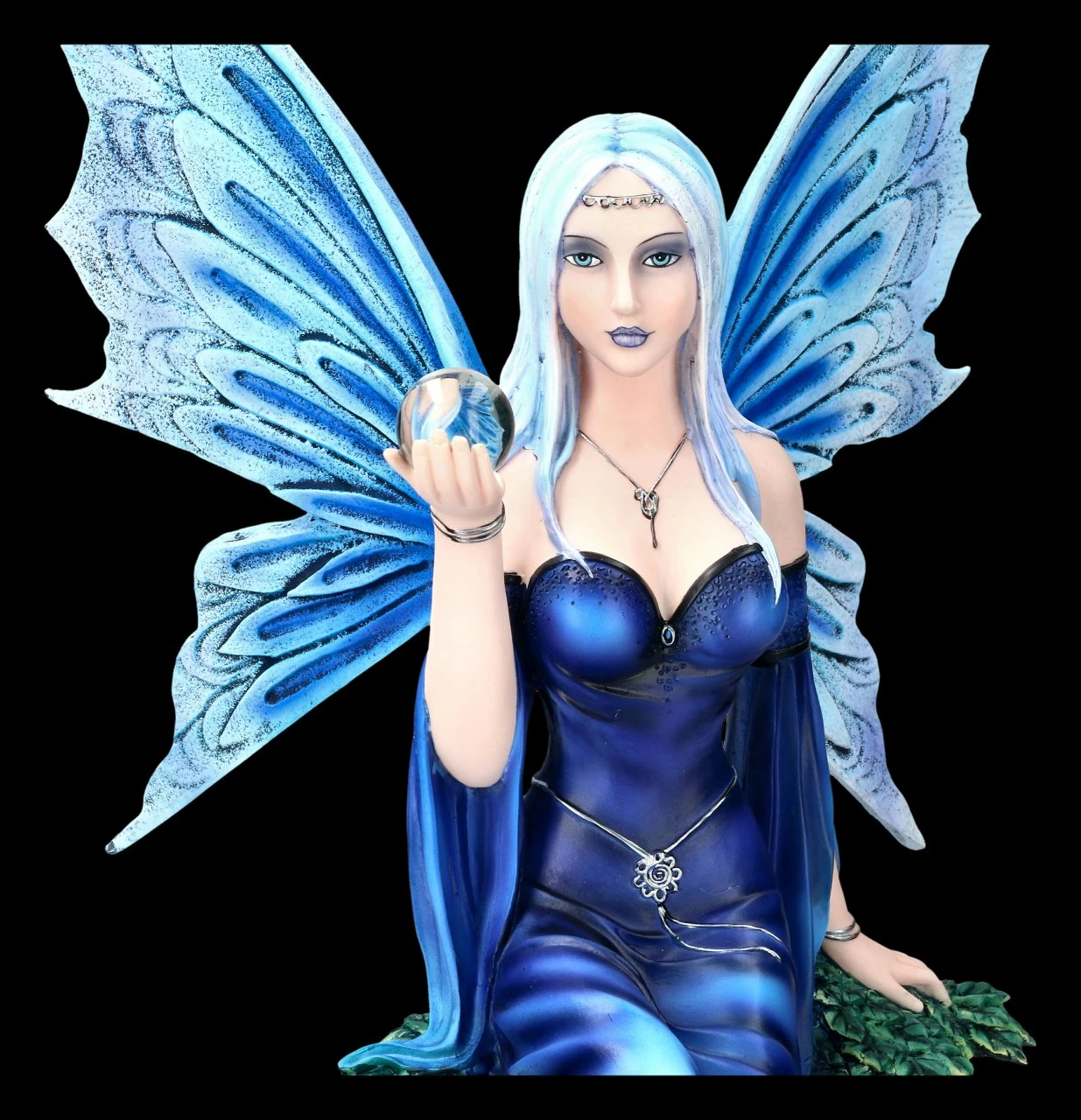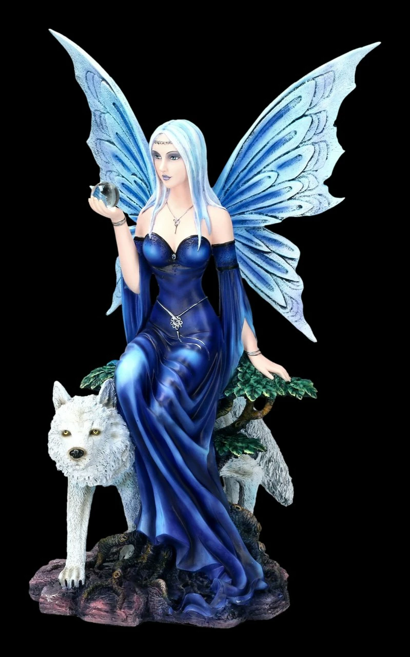 Zärtlich schmiegt sich der weiße Wolf an die wunderschöne Elfe Talanoa. Die schöne Elfe hat sich auf das Mooskissen auf einen Baumstamm gesetzt hat und hält eine magische Kugel in der Hand. Als Wächterin der Natur möchte sie alles im Blick behalten, was in ihrem Wald vor sich geht. Das dunkelblaue lange Kleid mit dem Mieder fällt in weichen Falten auf den Waldboden. Die silbrigen Haare und ihre schönen, blauen Flügel geben der Elfe Talanoa ein mystisches Flair, das durch ihren Begleiter, den weißen Wolf, noch verstärkt wird. Die schöne Elfenfigur ist detailreich aus Kunststein (Polyresin) gefertigt und liebevoll handbemalt. Mit ihrer beeindruckenden Höhe von 50 cm, der Breite von 30 cm und der Tiefe von 29 cm macht sie überall in Ihrem Wohnbereich eine gute Figur. Ihre Flügel sind zum Stecken. Die schöne Elfe ist auch ein wunderbares Geschenk für alle Elfen-Freunde.