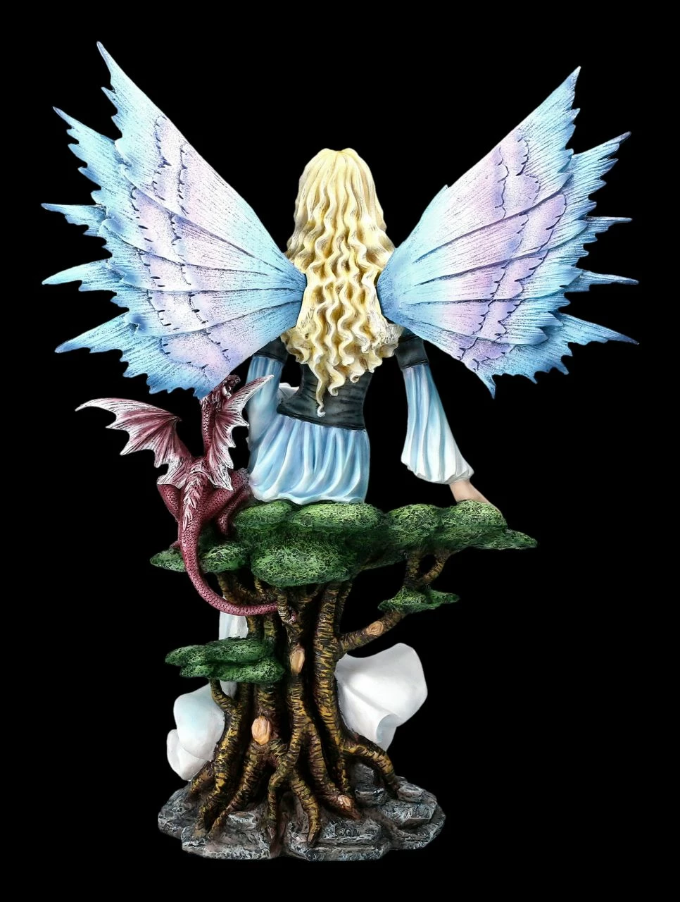 Gerade hat er der Weltenkönigin Bericht erstattet und jetzt schaut der rote Drache ehrfürchtig und bewundernd zu seiner Herrin auf und hofft auf ein Lob. Am meisten freut er sich, wenn sie ihm nach seinen Beobachtungsflügen über den Kopf streichelt. Völlig entspannt hat sich die Weltenkönigin auf dem Baum des Lebens niedergelassen und lauscht dem Bericht ihres Drachens. Einfühlsame Menschen werden in ihrem hellblauen, zart nuancierten Kleid die Farben eines sommerlichen Abends erkennen und die Elfe dahinter erahnen. Eine wunderschöne Elfen-Figur, die mit ihrer Höhe von 52 cm, der Breite von 33 cm und der Tiefe von 15 cm sehr beeindruckend ist. Die märchenhaft schöne Elfe ist bis zu den zarten, filigranen Flügeln, die zum Stecken sind, sorgsam und sehr liebevoll aus Kunststein (Polyresin) gefertigt und von Hand bemalt. Sie ist ein wunderbares Geschenk für jeden, der Elfen und Drachen liebt.