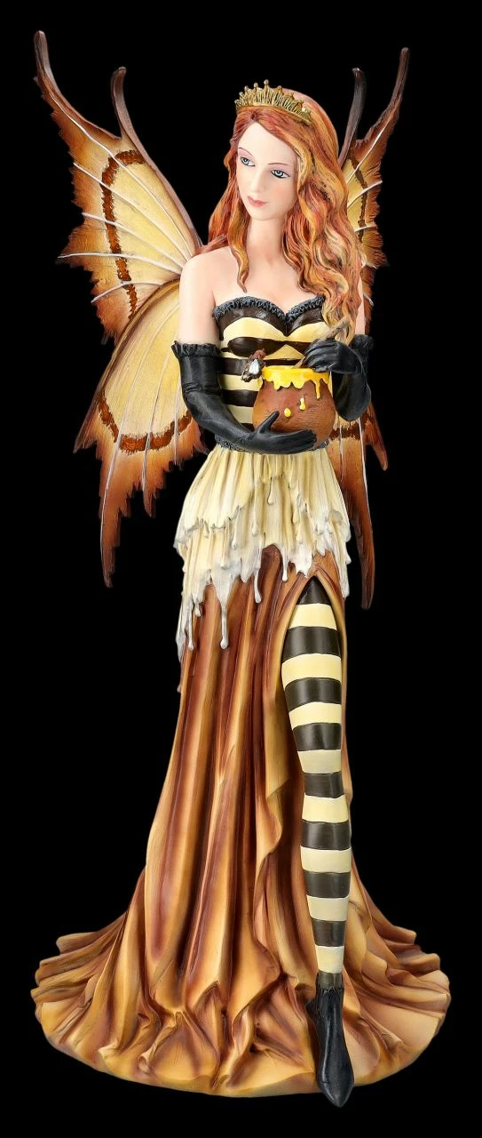 Bienen müssen geschützt werden, damit nicht nur wir unseren Honigtopf weiterhin füllen können. Auch die hinreißende Elfe Honey möchte uns zeigen, dass sie die Bienen schützt, damit auch der Honigtopf in ihren Händen stets gefüllt bleibt. In ihrem gestreiften Dress mit dem wie Honig fließenden Rock, der einen Blick auf ihre schönen Beine erlaubt und dem Überrock, der wie weicher Wachs über ihren Honigrock fließt und den zarten Flügeln sieht die schöne Elfe Honey beinahe selbst wie eine süße Biene aus. Die beeindruckende Elfen-Figur mit Honig ist 45,5 cm hoch, 23 cm breit und 21 cm tief. Sie ist detailreich aus hochwertigem Kunststein (Polyresin) gefertigt und wurde liebevoll von Hand bemalt. Die zarten Flügel sind zum Stecken. Nicht nur Sammler, sondern jeder der Honig liebt, wird sich über diese bezaubernde Elfe Honey als Geschenk mit Sicherheit sehr freuen.