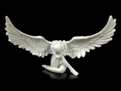 Sie müssen nicht traurig sein, denn Ihr Schutzengel ist bei Ihnen. Den Kopf verträumt auf die Arme gelegt und mit weit ausgebreiteten Schwingen sitzt der wunderschöne weiße Engel vor Ihnen. Angels Sympathy ist wunderschön in beinahe marmornen Weiß aus Kunststein (Polyresin) gefertigt. Mit der Höhe von 21,5 cm, der Breite von 35,5 cm und der Tiefe von 15,5 cm ist dieses filigran gearbeitete himmlische Wesen nicht nur schön anzusehen, der Engel ist auch ein wunderbares Geschenk für jeden, dem Sie Trost spenden möchten.