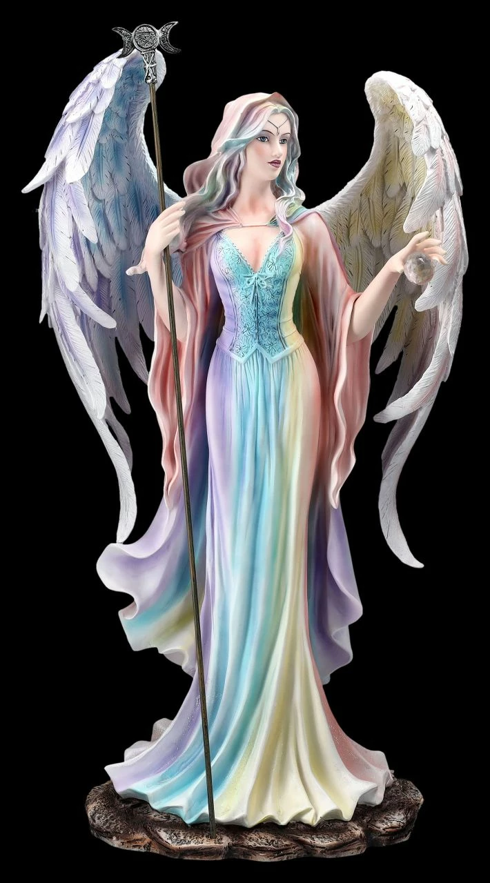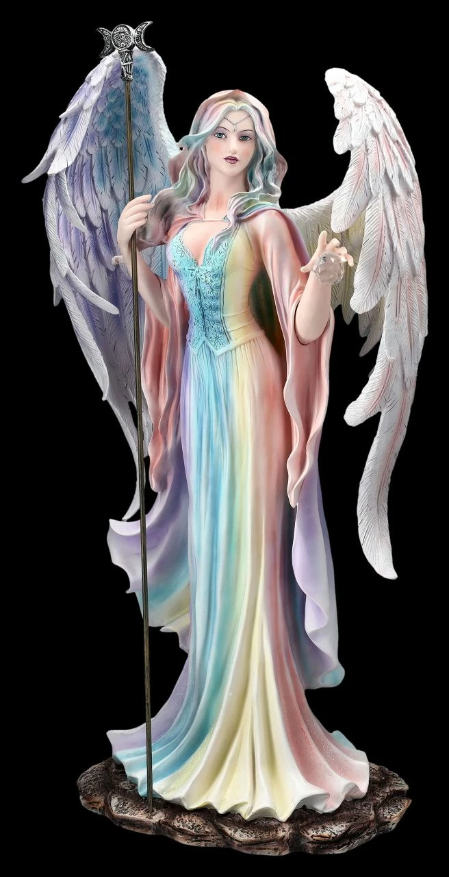 Engel haben die vielfältigsten Aufgaben. Als Schutzengel wachen sie über uns, wie auch diese wundervolle und beeindruckende Engel-Figur mit den regenbogenfarbenen Haaren fantastisch zeigt. In ihrem weich fließenden, regenbogenfarbenen Kleid steht die Wächterin Vanavil da und scheint alles genau im Blick zu haben. In ihrer linken Hand hält sie eine Kristallkugel und mit der rechten Hand hält sie ein Zepter mit dem magischen Schutzsymbol der Dreifach-Göttin. Die prachtvollen und ebenfalls regenbogenfarbenen Flügel des 58,5 cm hohen, 26,5 cm breiten und 21 cm tiefen wunderschönen Engels sowie das Zepter mit dem Dreifach-Mond sind zum Stecken. Die herrliche Engelfigur ist aus liebevoll handbemaltem Kunststein (Polyresin) gefertigt. Dieser wunderschöne Schutzengel wird zwar überall zum sofortigen Blickfang, sollte aber am besten so aufgestellt werden, dass man ihn auch selbst ständig im Blick behält. Die prächtige Regenbogen Wächterin Vanavil ist aber auch ein fantasievolles und liebevolles Geschenk für jeden, dem Sie zeigen möchten, dass Schutzengel manchmal auch sichtbar werden.