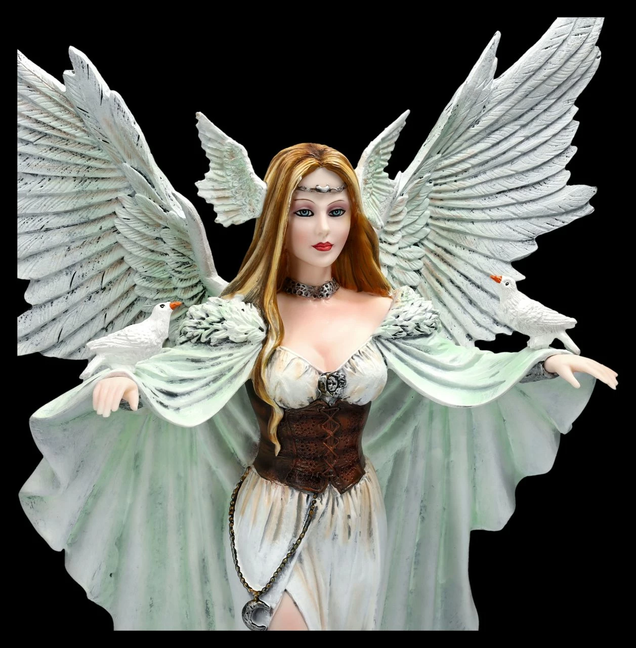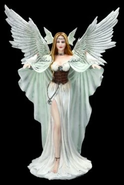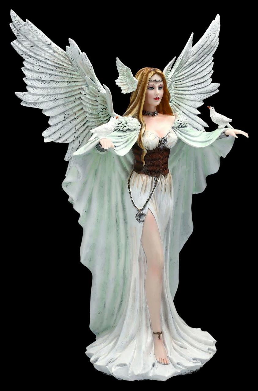 Wer möchte nicht von diesem wunderbaren Engel empfangen werden? Da fühlt sich doch jeder wie im 7. Himmel, wenn er diesen wunderschönen Engel entdeckt. Daher sollte dieser herrliche Engel seinen Platz auch da finden, wo er jedem bedeuten kann, dass er im Himmel willkommen ist. Die wunderschöne und prächtige Engel-Figur wurde detailreich aus hochwertigen Kunststein (Polyresin) gefertigt und liebevoll von Hand bemalt. Die detailreichen und schönen Flügel sind zum Stecken. Der 43 cm hohe, 29 cm breite und 19 cm tiefe Engel in dem zartblauen Kleid hält weiße Tauben auf den weit zum Empfang ausgebreiteten Händen. Er ist einfach wundervoll anzusehen und damit auch ein perfektes Geschenk für jeden Sammler.