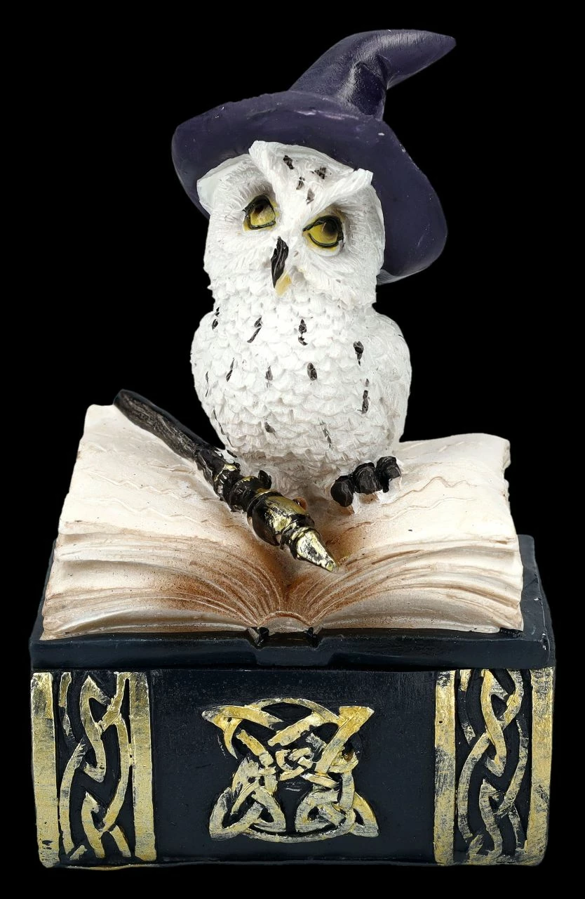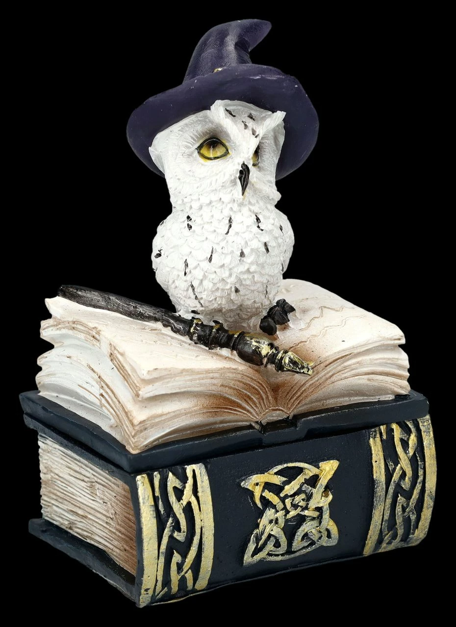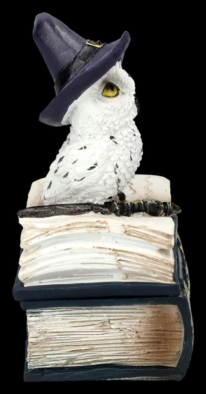 Völlig konzentriert sitzt die Schneeeule mit dem Zauberstab auf dem magischen Buch und möchte die wichtigsten Zaubersprüche auswendig lernen. Dass sich in dem Buch auch etwas verstecken lässt, sieht man nicht auf den ersten Blick. Die 11 cm hohe, 7 cm breite und 5,5 cm tiefe Eulen-Figur ist aus liebevoll handbemaltem Kunststein (Polyresin) gefertigt. Sie ist nicht nur für Halloween eine niedliche Dekoration, sondern als Schatulle mit den Maßen von H: 2,5 cm / B: 5,5 cm / T: 4 cm auch eine perfekte Verpackung für ein kleines Geschenk.