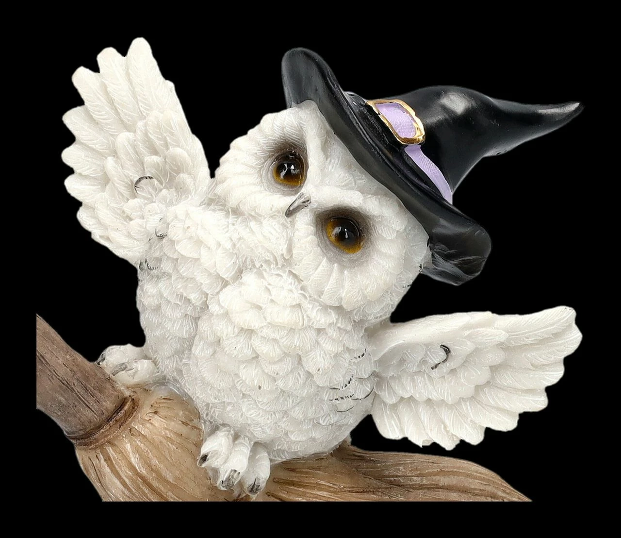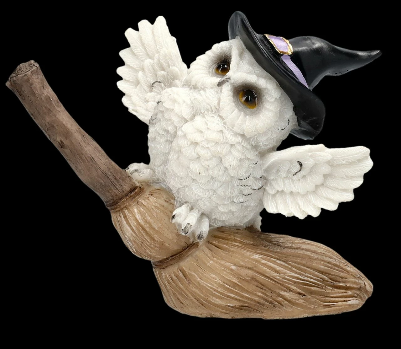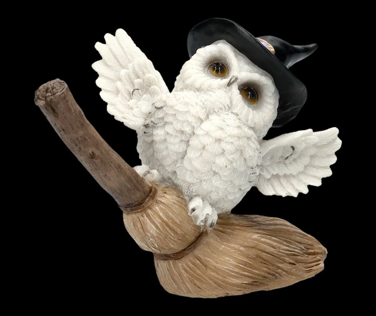 Da hat sich die kleine Eule einfach den Hexenhut aufgesetzt und den Hexenbesen geschnappt. Der Zauberspruch wirkt und der Besen will sich so schnell in die Lüfte erheben, dass die kleine Schneeule etwas erschrocken guckt und mühsam mit den Flügeln flatternd auf dem Besen balanciert. Die lustige Eulen-Figur auf dem Hexenbesen aus handbemaltem Kunststein (Polyresin) ist 13 cm hoch, 11 cm breit und 5 cm tief. Sie ist eine witzige Deko und ein perfektes Geschenk für eine kleine Hexe.