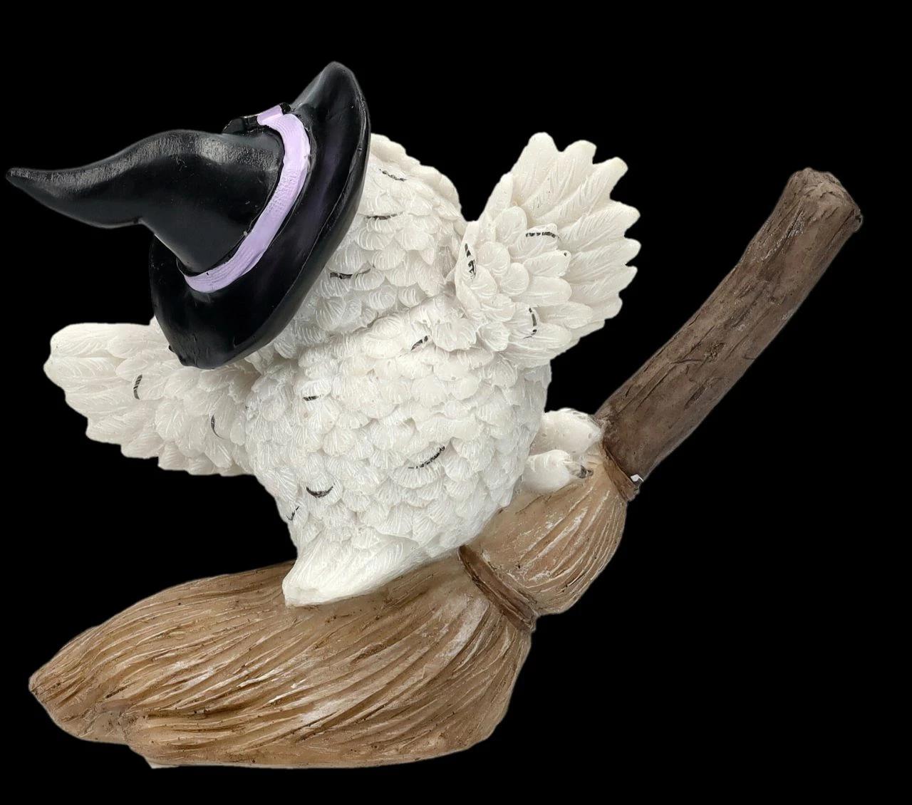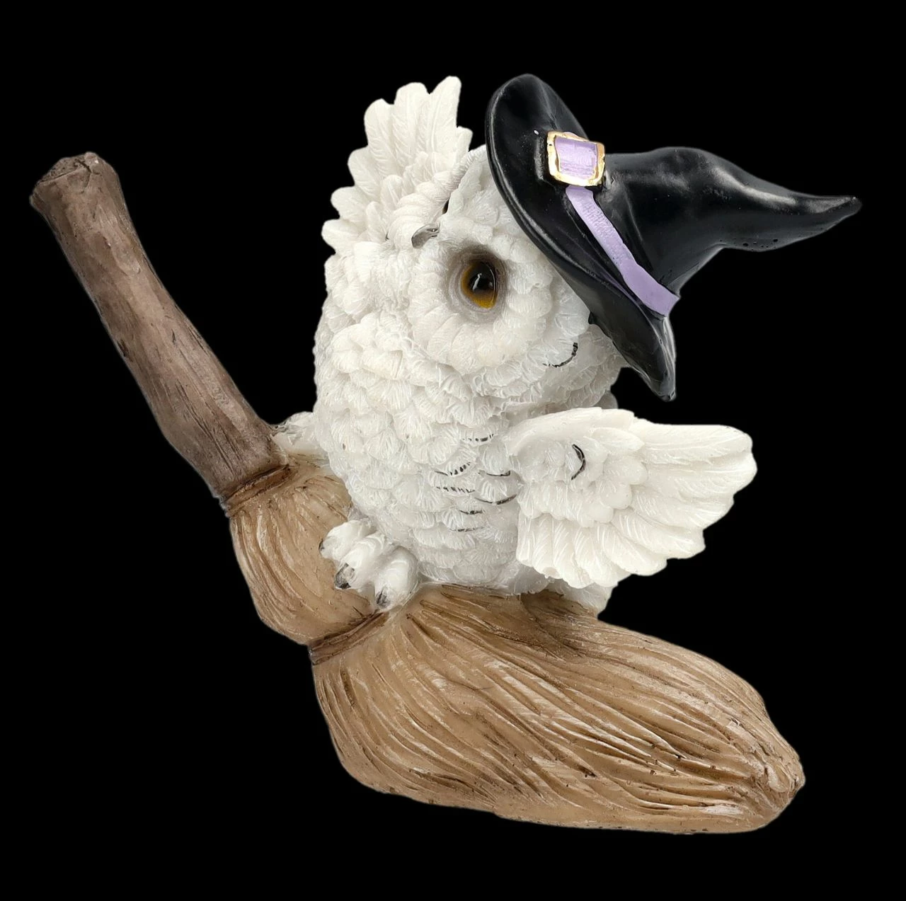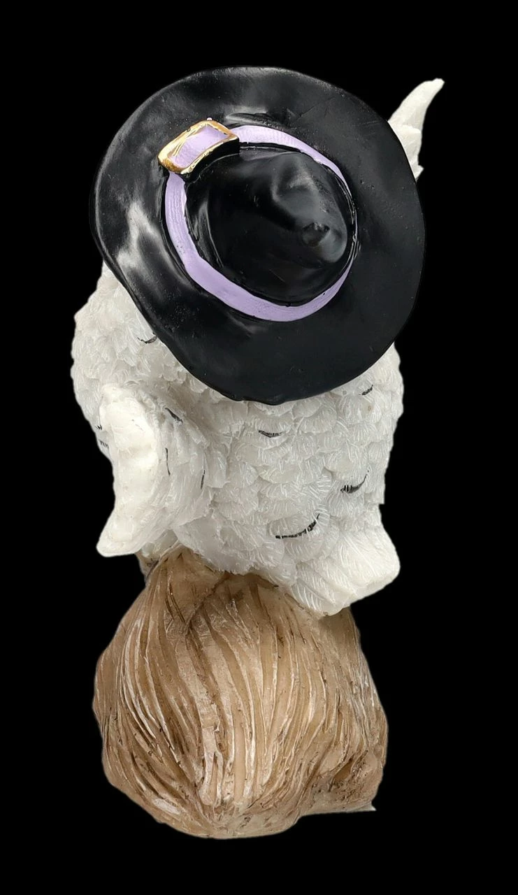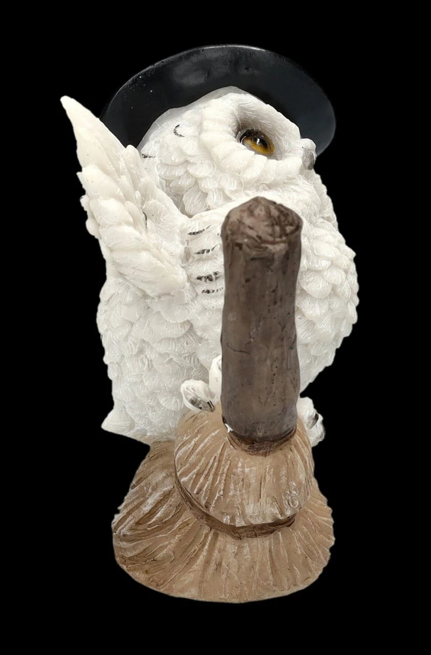 Da hat sich die kleine Eule einfach den Hexenhut aufgesetzt und den Hexenbesen geschnappt. Der Zauberspruch wirkt und der Besen will sich so schnell in die Lüfte erheben, dass die kleine Schneeule etwas erschrocken guckt und mühsam mit den Flügeln flatternd auf dem Besen balanciert. Die lustige Eulen-Figur auf dem Hexenbesen aus handbemaltem Kunststein (Polyresin) ist 13 cm hoch, 11 cm breit und 5 cm tief. Sie ist eine witzige Deko und ein perfektes Geschenk für eine kleine Hexe.