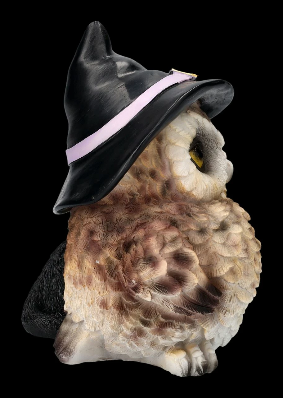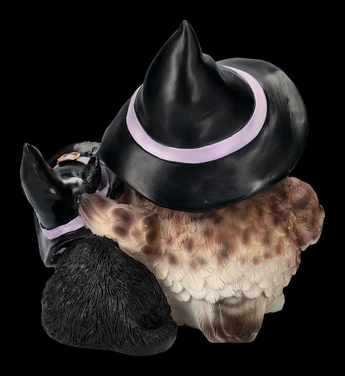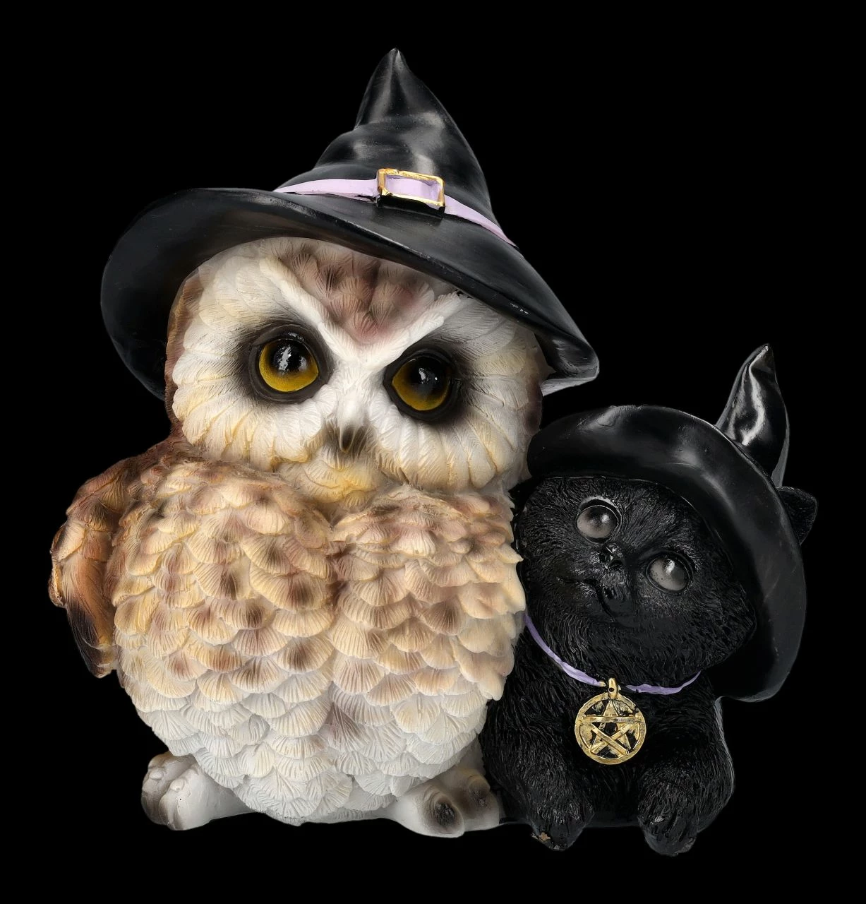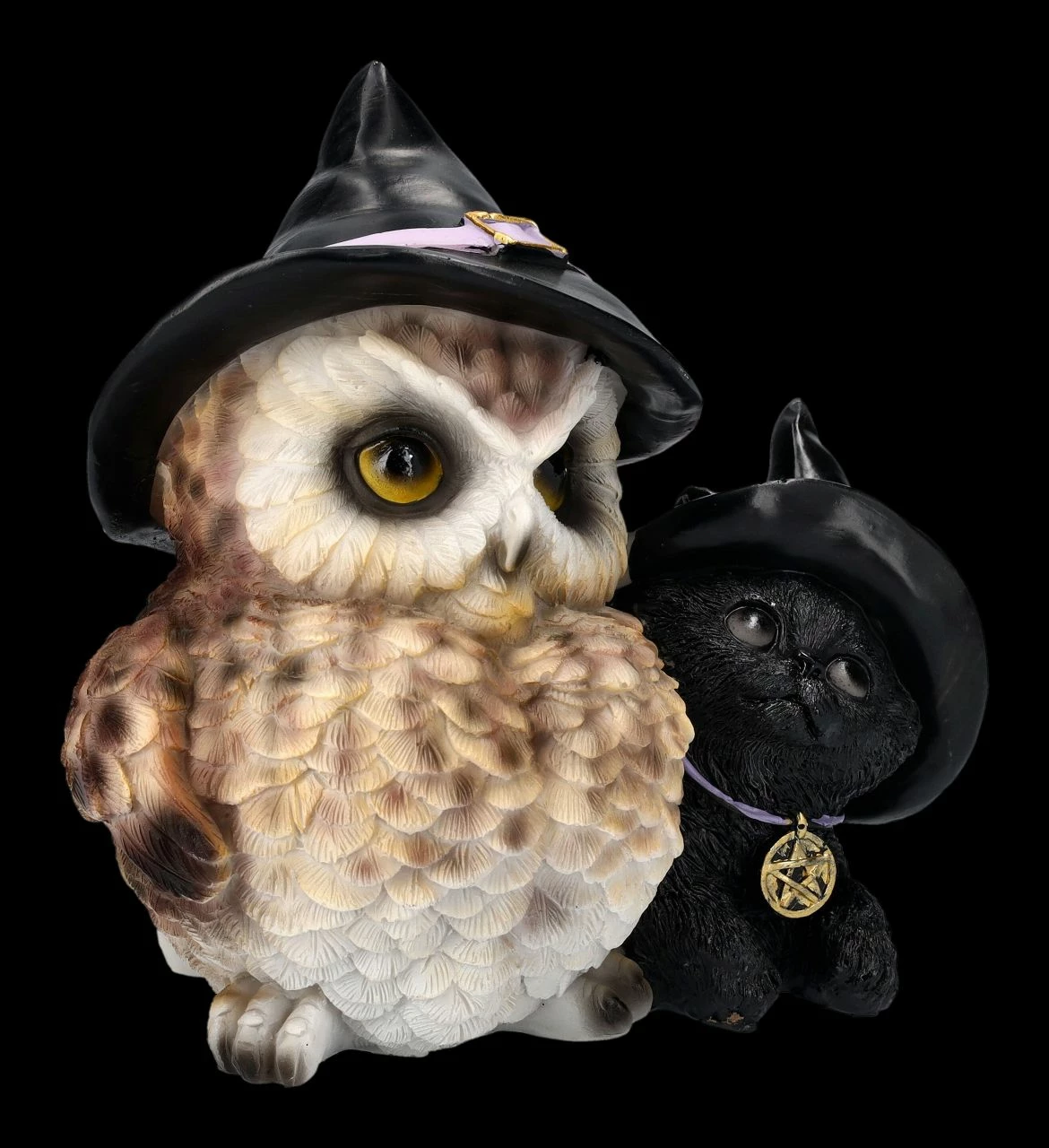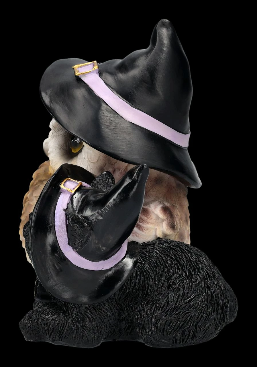 Hier haben sich zwei zusammengetan…. Eulen gelten ja als weise und intelligent, aber als Nachttier wurde sie in vielen Kulturen auch gefürchtet. Auch Katzen wird niemand Intelligenz absprechen, aber schwarze Katzen können sich nachts gut tarnen und so ist es kein Wunder, dass den beiden Tieren von manchen magische Hexenkräfte zugeschrieben wurden. Diese beiden tragen jedoch das Symbol der Hexen, nämlich ihre Hexenhüte ganz stolz. Liebevoll und bewundernd schaut die schwarze Katze mit dem Pentagramm-Schmuckstück zur größeren Freundin auf. Das lustige Duo mit den Hexenhüten wurde aus liebevoll handbemaltem Kunststein (Polyresin) gefertigt und ist 15,5 cm hoch, 15,5 cm breit und 12 cm tief. Als Deko zu Halloween ist die Eulen- und Katzen-Figur mit den Hexenhüten ist fantasievolles Geschenk.