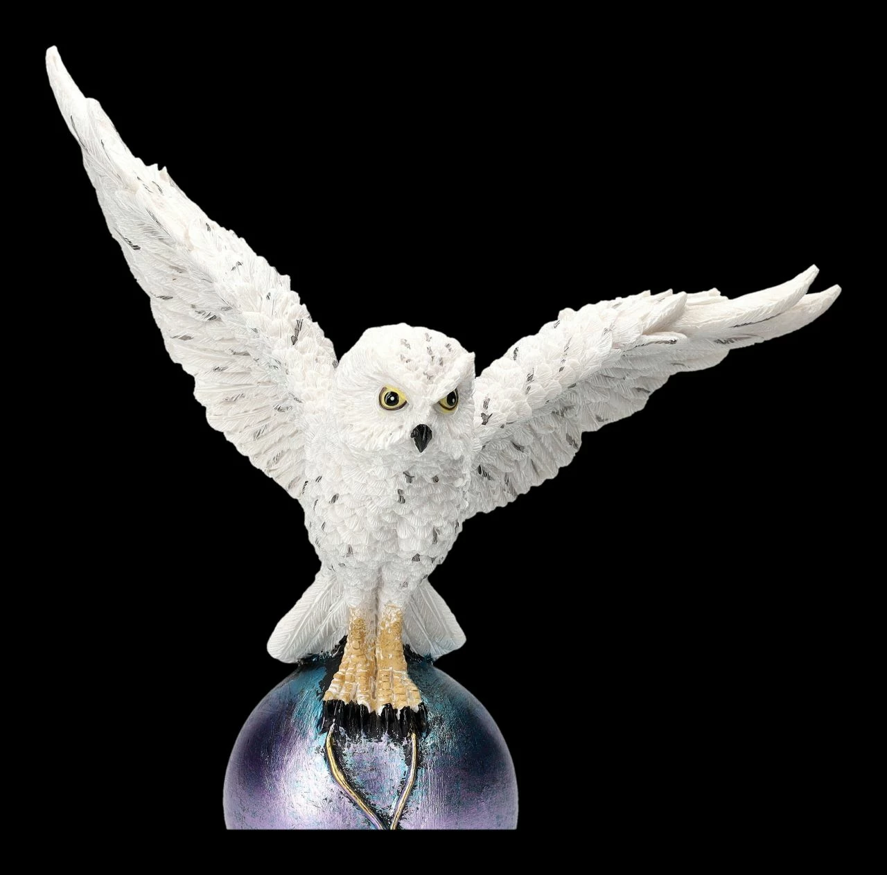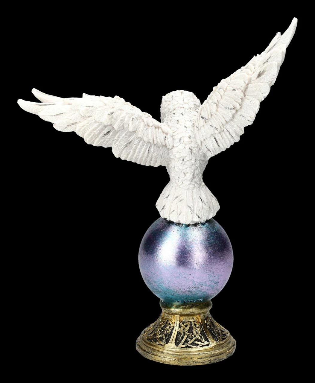 Die weiße Schneeeule scheint gerade auf der magischen Kugel gelandet zu sein. In ihren Krallen hält sie eine Kette mit einem Pentagramm-Anhänger. Magisch schön ist die Eulenfigur aus liebevoll handbemaltem Kunststein (Polyresin). Mit ihrer Höhe von 23,5 cm, der Breite von 19 cm und der Tiefe von 9 cm ist diese wunderschöne Eule auf der magischen Kugel ein fantasievoller Blickfang.