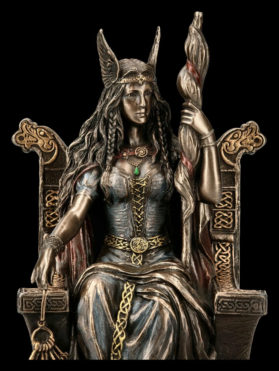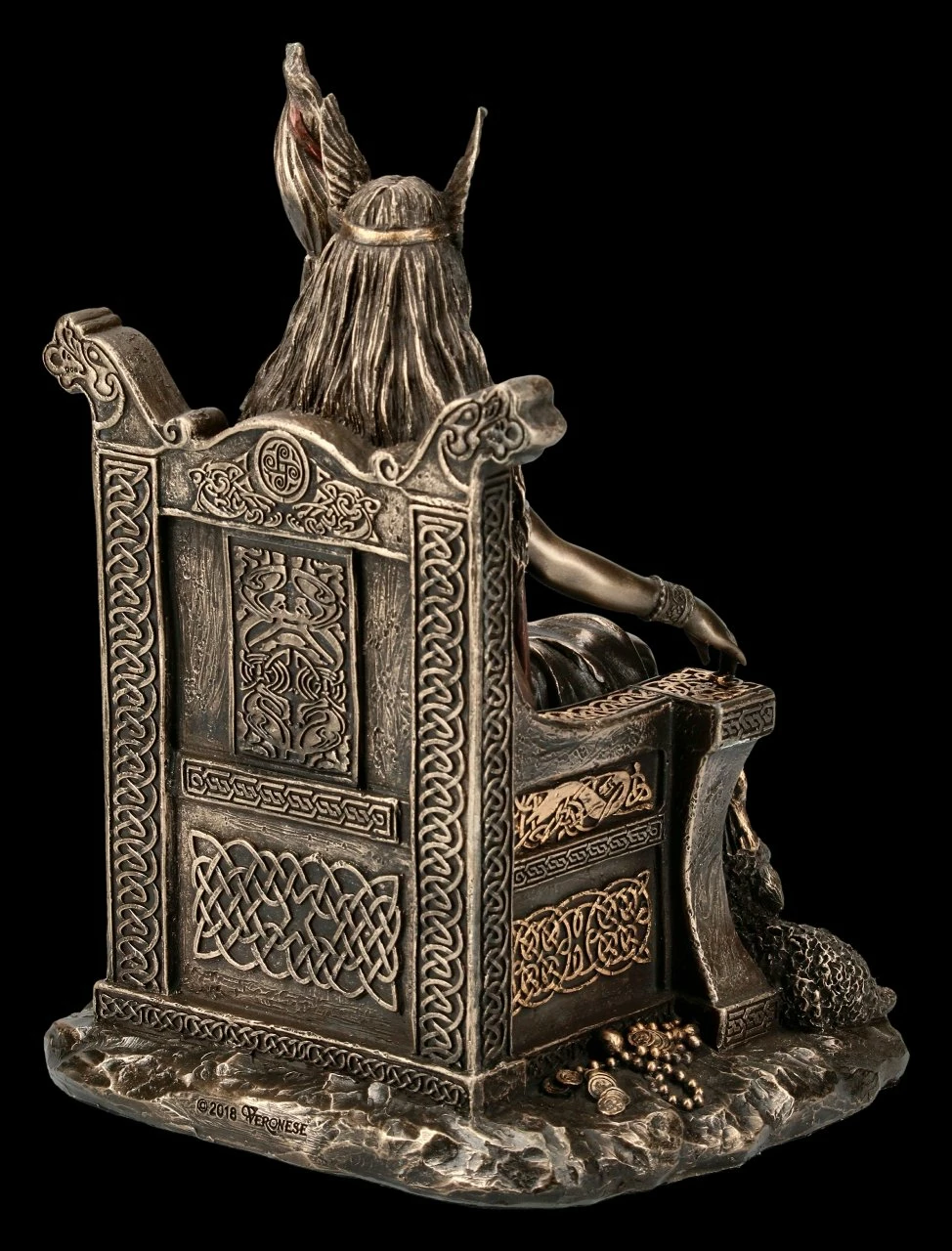 Passend zum Göttervater Odin auf Thron, hat Veronese eine wunderschöne Frigga Figur aus edel bronziertem und coloriertem Kunststein (Polyresin) geschaffen. Odins Frau Frigg – auch Frigga genannt – ist die Schutzgöttin von Heim und Herd sowie die Göttin der Mutterschaft und Ehe. Diese wunderbare Frigga Figur sollte in keiner Wikinger Sammlung fehlen.