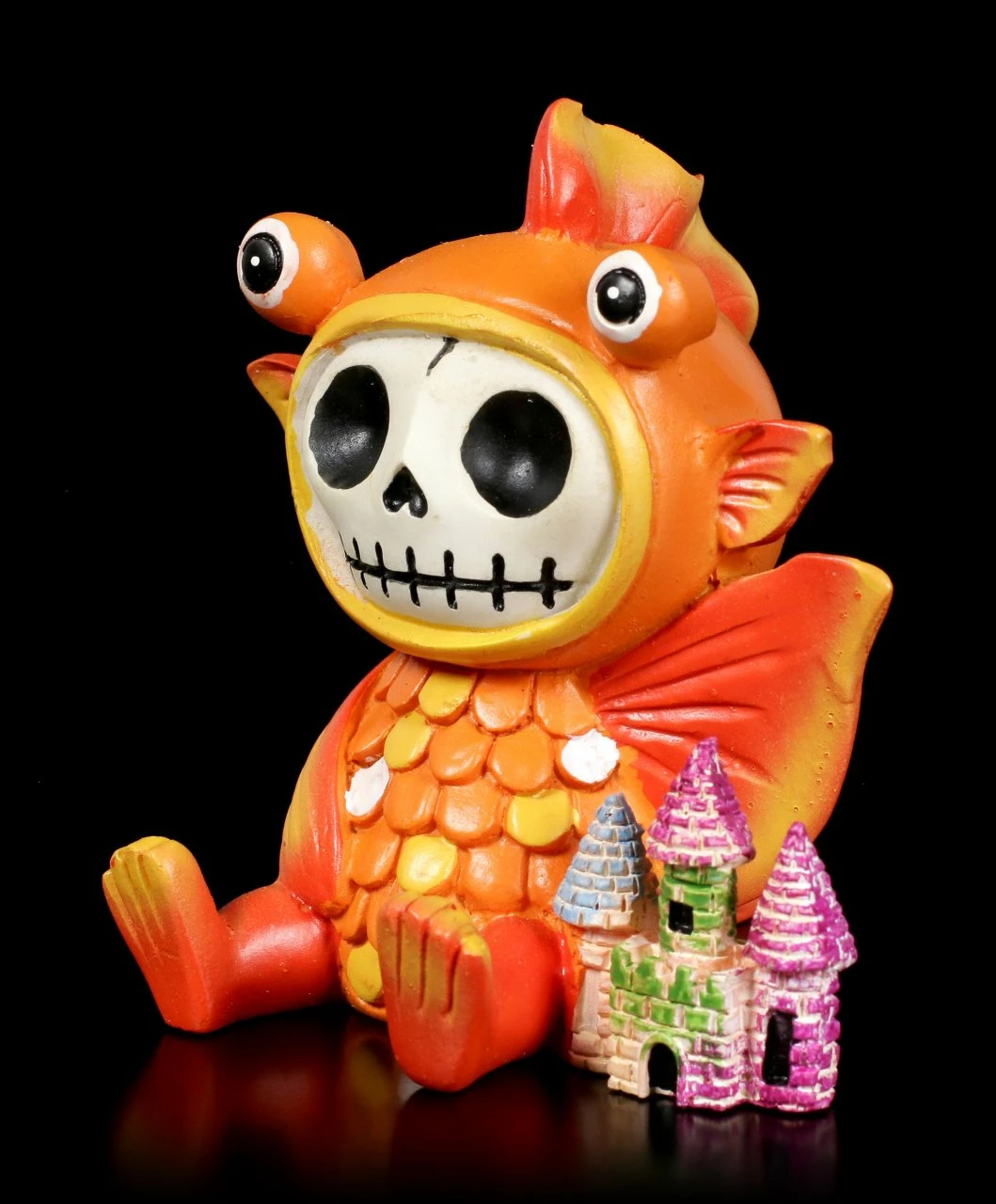 Blubb, Blubb, Blubb… Der kleine Furrybone liebt Fische und heute wollte er ihnen so nah wie möglich sein und hat sich als Goldfisch verkleidet. Sieht er nicht toll aus? Die niedliche Furrybones Figur ist aus Kunststein und wurde liebevoll und farbenprächtig handbemalt.