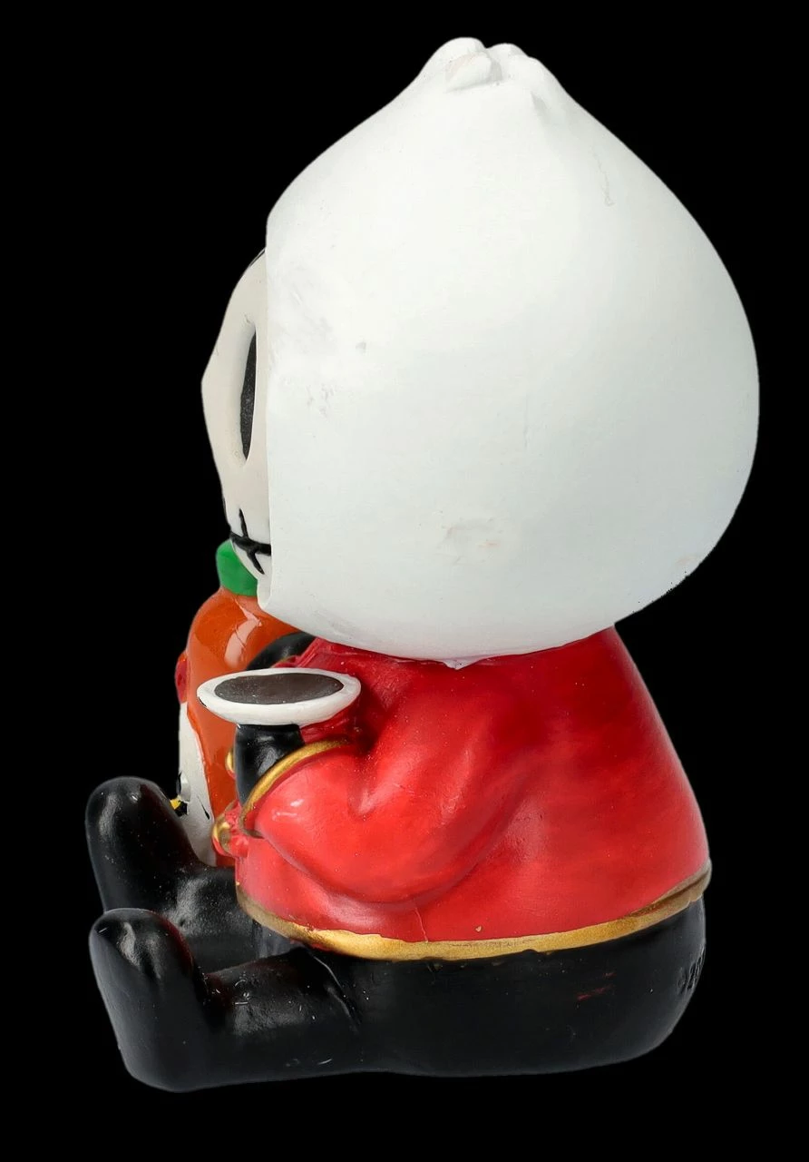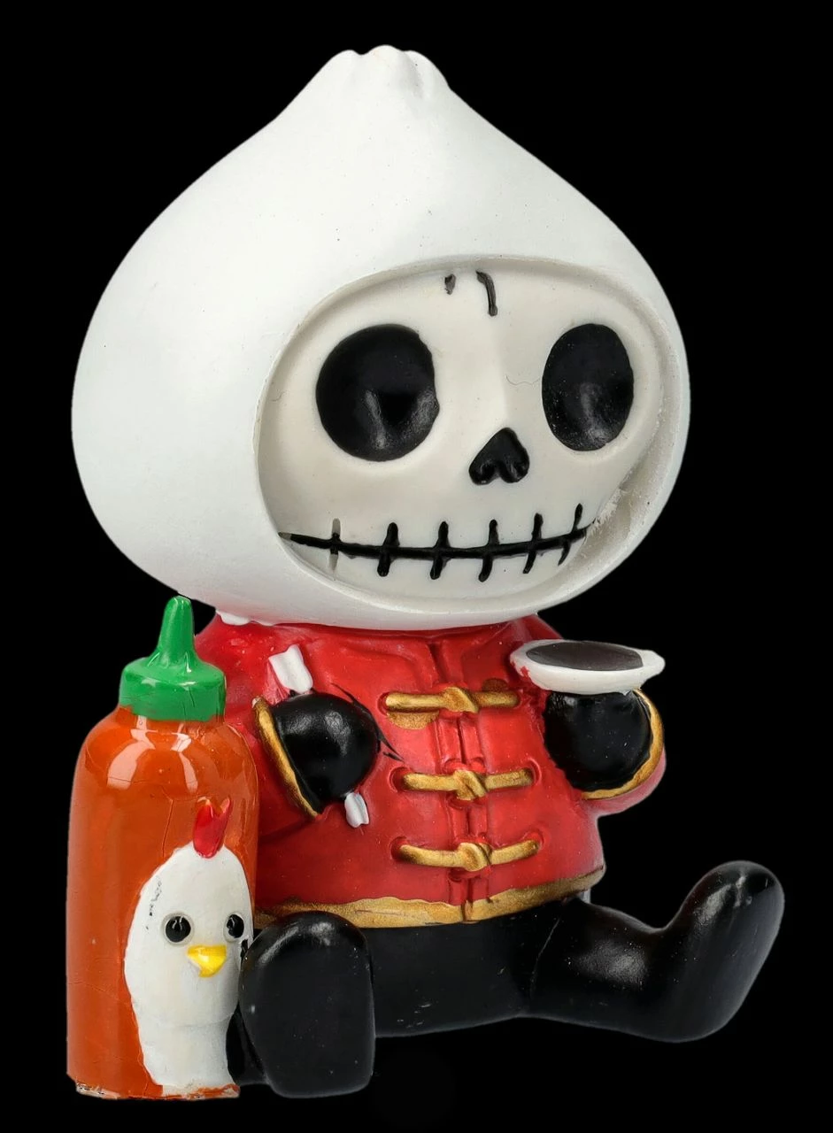 Der kleine freche Furrybones Bao hat sich als chinesische Teigtasche verkleidet und möchte sich nun zwischen all die Köstlichkeiten mogeln, die auf dem Tisch bei der Halloween- oder Gothic-Party stehen. Furrybones lieben es einfach sich zu verkleiden und vielleicht hofft Bao, etwas von all den leckeren Dingen abzubekommen. Das kultige Furrybones Skelettchen als chinesiche Teigrasche Bao ist aus liebevoll handbemaltem Kunststein (Polyresin). Es ist 7,5 cm hoch, 5,5 cm breit und 4 cm tief und als original Furrybones Figur nicht nur für Gothics eine geniale Deko. Der frech grinsende kleine Bao in der Teigtasche ist ein Super-Geschenk für Sammler und alle, die von den niedlichen Furrybones begeistert sind. Daher kommt es gleich in einem Geschenkkarton. Weitere schaurig-witzige Freunde von Bao sind.in unserem Shop zu finden.