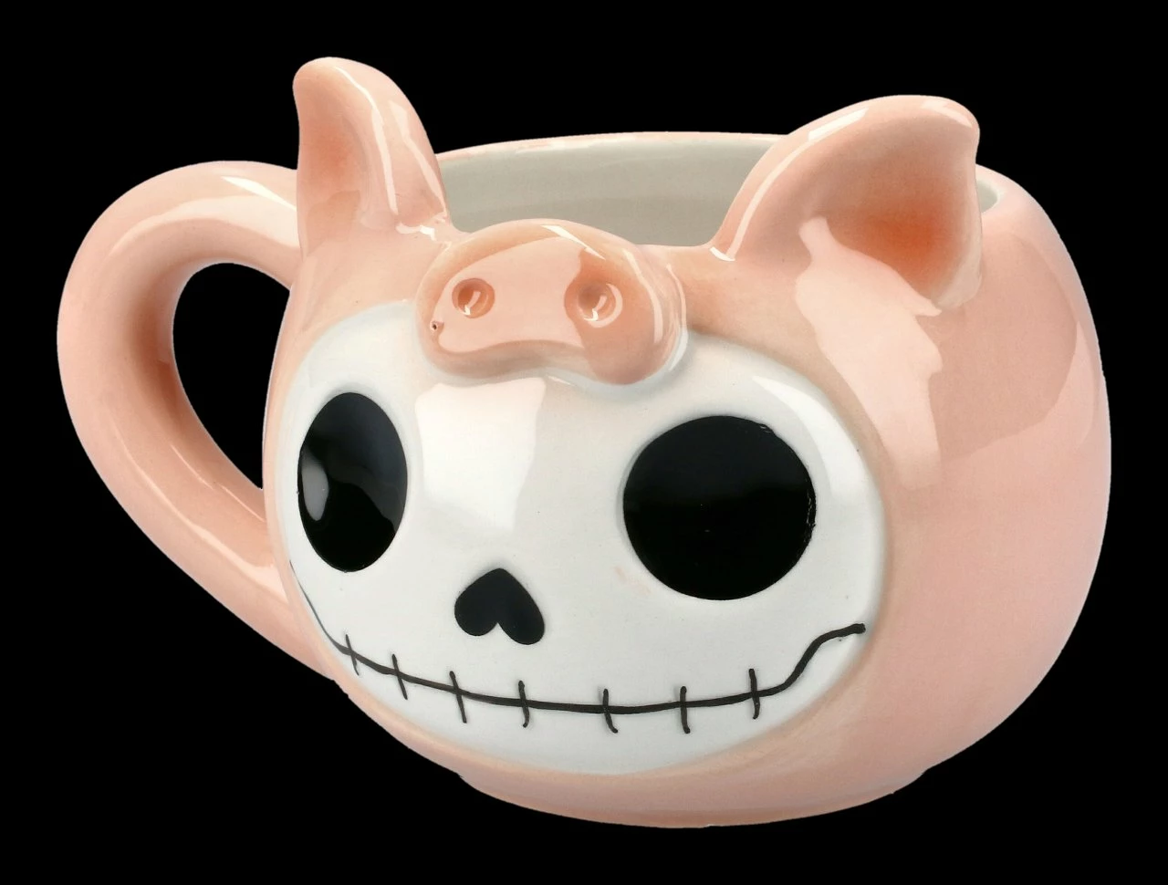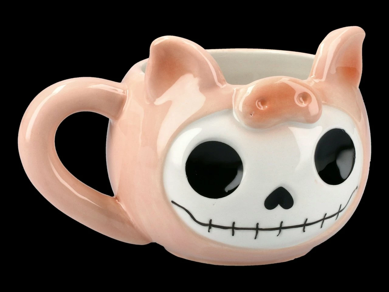 Die handbemalte Keramiktasse Bacon von den Furrybones ist für jeden Liebhaber und Sammler der kleinen lustigen Skelett-Tiere ein tolles Geschenk. Die Schweinchen Tasse hat ein Fassungsvermögen von 350 ml, wird in einer Geschenkbox geliefert und ist Geschirrspüler geeignet.