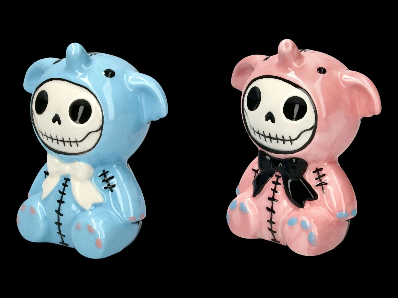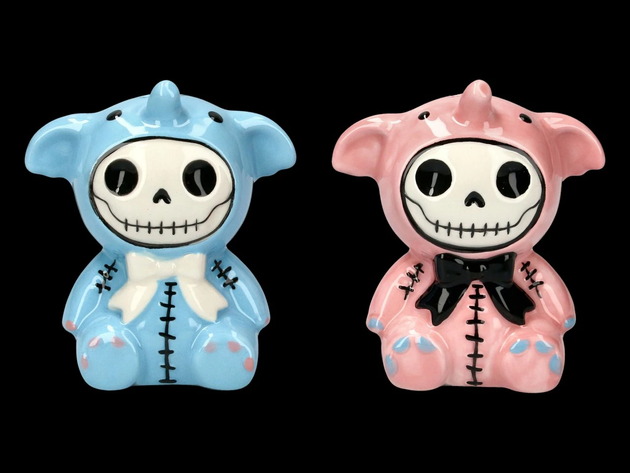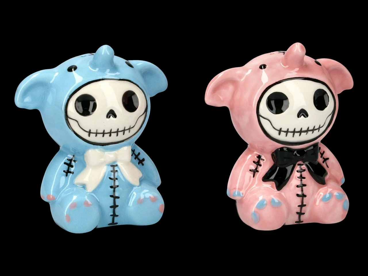 Es waren einmal zwei Elefanten – ein kleiner rosa Elefant und ein kleiner blauer und sie waren die besten Freunde…. So könnte die Geschichte lauten, würden nicht zwei kleine fiese Furrybones in diesem tollen Salz- und Pfefferstreuer Elefun stecken. Die lustigen Salz- und Pfefferstreuer sind aus handbemalter Keramik gefertigt und mit ihrem Skelettgesichtchen eine wirklich außergewöhniche Deko für jeden Esstisch. Mit ihrer Höhe von je 8,5 cm, der Breite von je 7,5 cm und der Tiefe von je 5 cm sind sie nicht nur für Furrybones Sammler ein außergewöhnilches Geschenk.