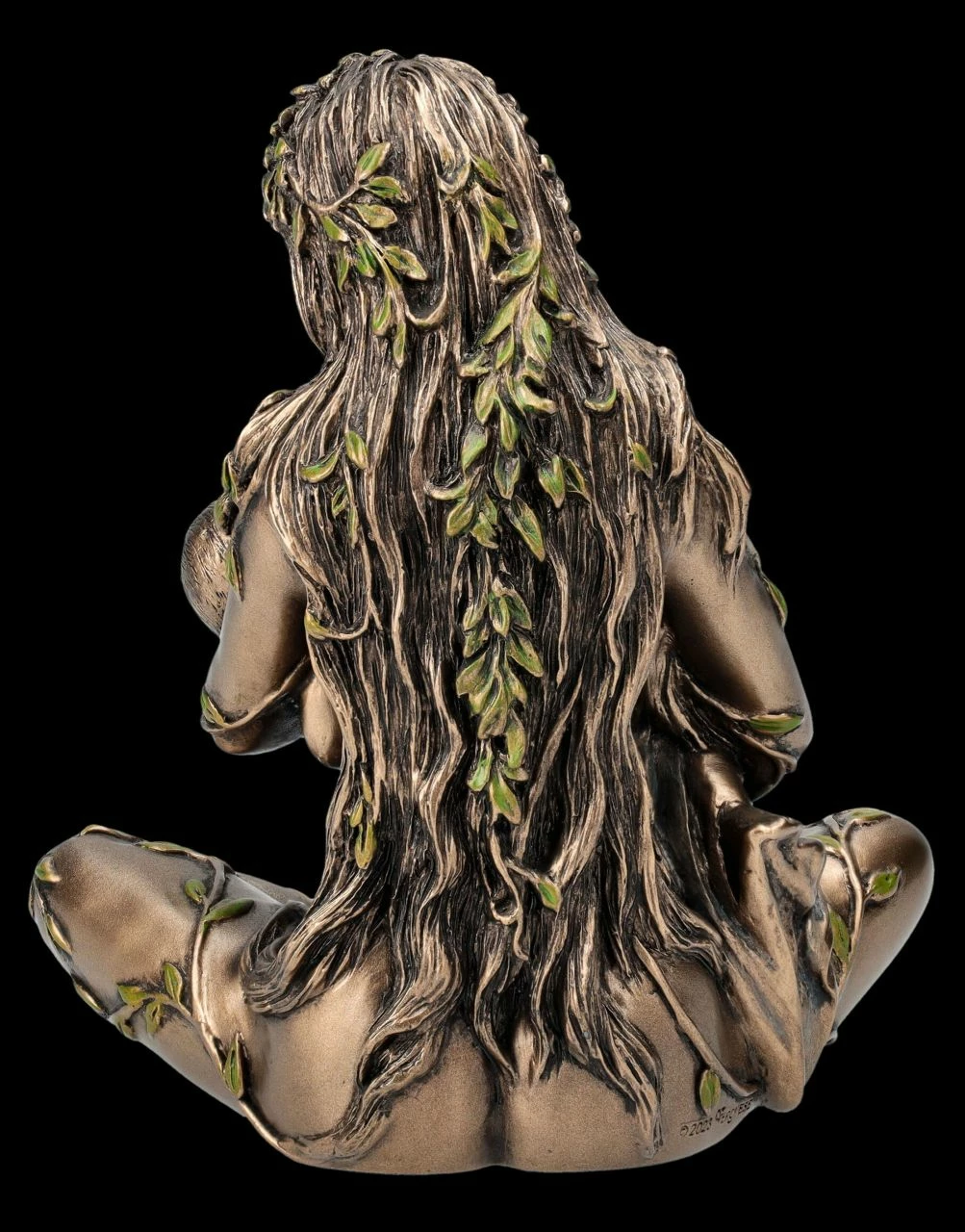 Abbildungen und Darstellungen der Erdgöttin Gaia aus der griechischen Mythologie zeigen sie meist als Schwangere, die liebevoll ihren Bauch umfasst. Bei dieser einzigartigen Figur aus der Studio Collection von Veronese hat Gaia die Erde bereits geboren und zärtlich an ihre Brust gelegt. Die 11 cm hohe, 9,5 cm breite und 5,5 cm tiefe kleine Gaia-Skulptur aus Kunststein (Polyresin) ist aufwändig bronziert und wunderschön coloriert. Sie wirkt durch die Darstellung mit dem Baby, das von der Göttin gesäugt wird, sehr faszinierend und effektvoll. Die wunderbare kleine Skulptur ist für alle die sich für die griechische Mythologie interessieren, aber auch für Mütter, ein perfektes Geschenk.
