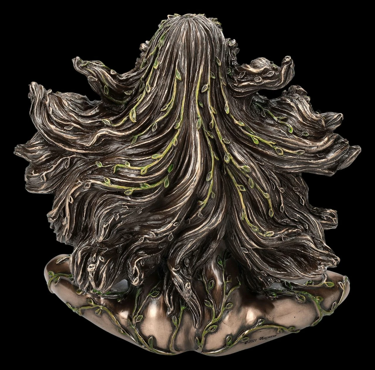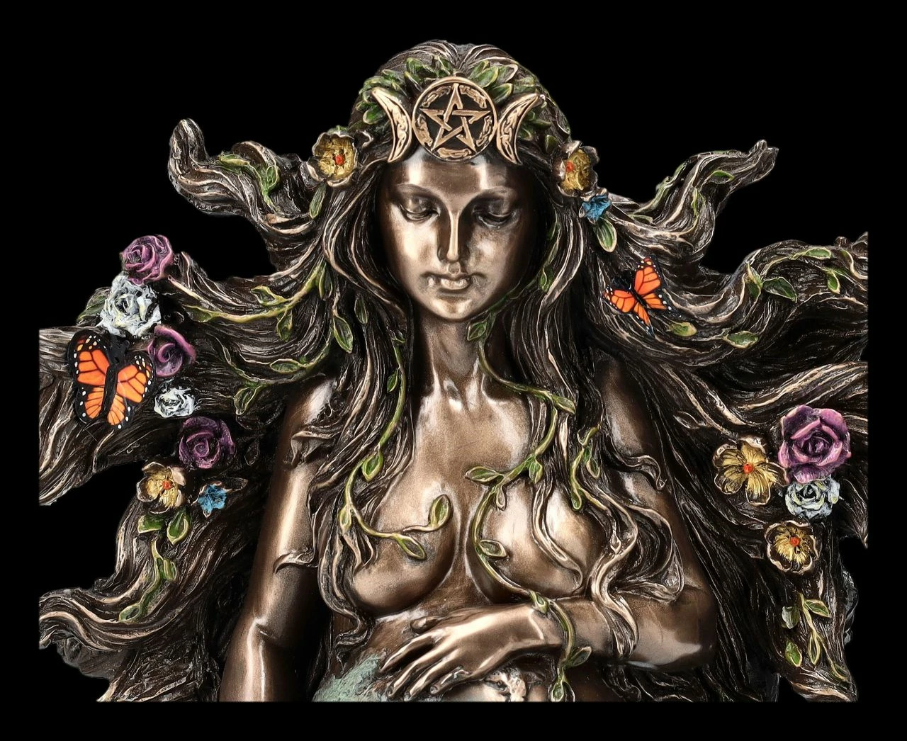 Glücklich lächelnd sitzt Gaia, die in der altgriechischen Mythologie als Mutter Erde verehrt wurde, auf dem Boden. Mit ihren Händen streichelt sie zärtlich ihren schwangeren Bauch, den man sofort als Erde erkennen kann. Grüne Ranken winden sich um den Körper der bezaubernden Gaia-Figur und in ihrem in langen Wellen fallenden Haar sammeln sich Blüten und Schmetterlinge. Die Urgöttin Gaia wird als Göttin der Natur die vielfältigen Arten der Pflanzen und Tiere nach der Geburt auf der Erde verteilen, damit sie Menschen Freude und Hoffnung geben. Diese wunderschöne Gaia-Figur aus der Studio Collection von Verones wurde detailreich aus edel bronziertem und sehr fein coloriertem Kunststein (Polyresin) gefertigt. Die 17,5 cm hohe, 16,5 cm breite und 8,5 cm tiefe Gaia-Figur demonstriert in dieser herrlichen Darstellung perfekt Leben, Körperlichkeit, Fruchtbarkeit und Mütterlichkeit und ist damit ein wunderbares Geschenk für alle, die die Natur lieben und im Sinne der Mutter Erde schützen möchten.