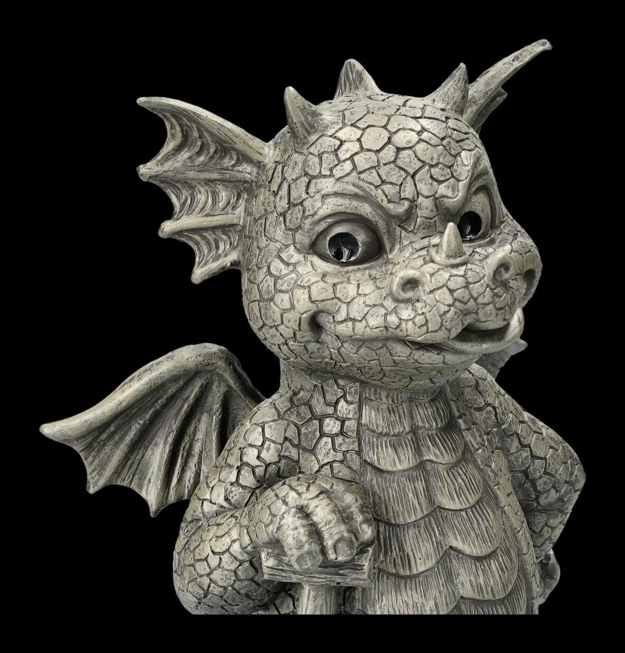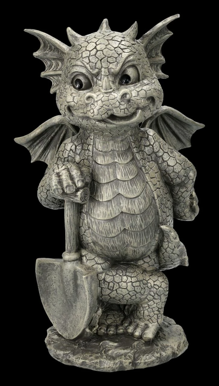 Gartenarbeit kann, wie man diesem lustigen Drachen ansieht, doch schon sehr anstrengend sein. Vielleicht hätte er zwischendurch etwas trinken sollen, dann würde ihm die Zunge nicht so heraushängen. Der 29,5 cm hohe, 17 cm breite und 13,5 cm tiefe Drache als Gärtner ist detailreich aus liebevoll handbemaltem Kunststein (Polyresin) gefertigt. Ob im Gartenbereich, der Terrasse, dem Balkon oder auch auf der Blumenbank im Wohnbereich – dieser niedlich Gärtner macht überall eine gute Figur.