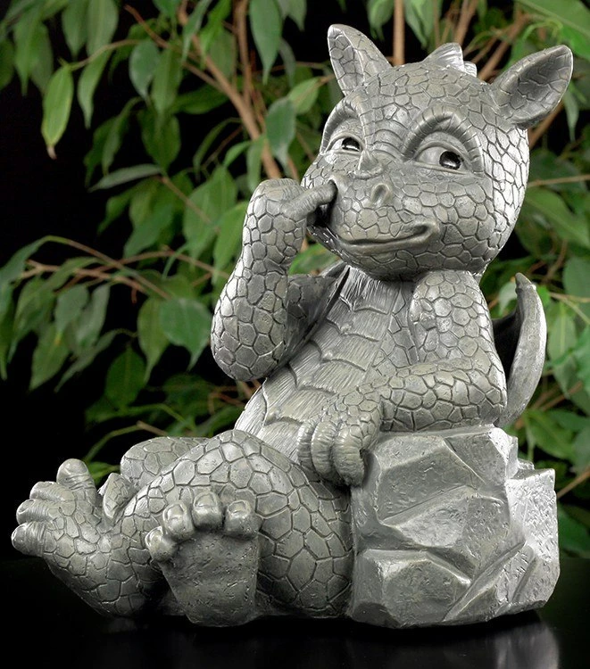 Ganz tiefenentspannt bohrt der freche Drache in der Nase. Dieser niedliche Drache schmückt dekorativ Ihren Garten. Der kleine Drache ist detailreich aus handbemaltem Kunststein (Polyresin) gefertigt. So ein niedlicher Drache – den muss man einfach liebhaben.