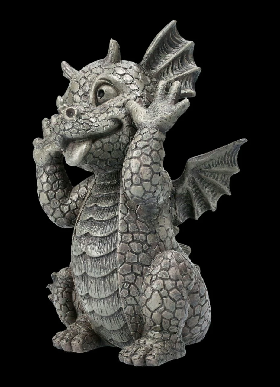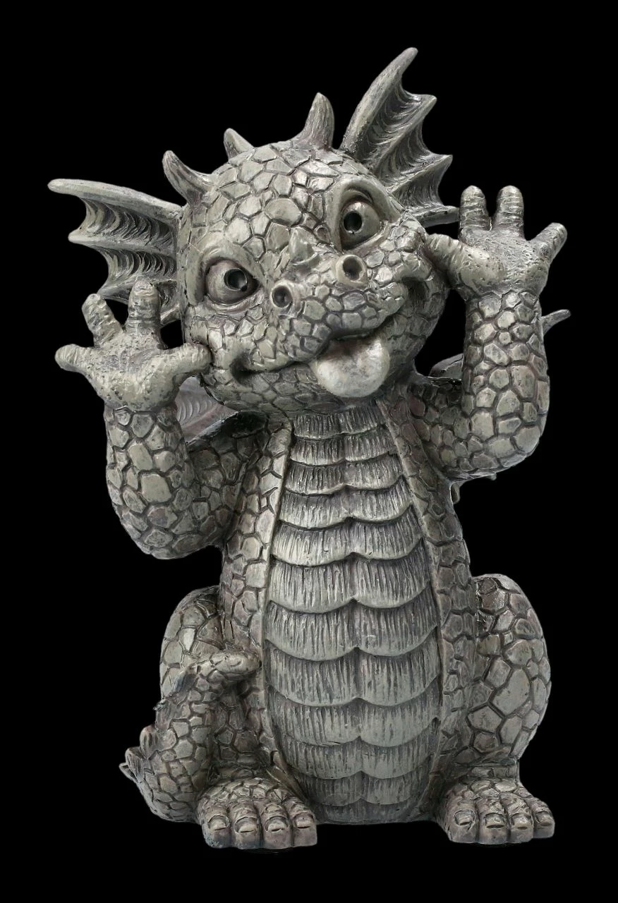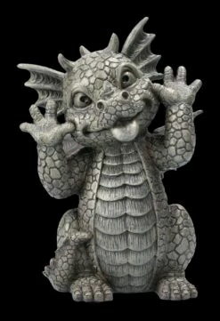 Wen dieser kleine freche Drache mit seinen Grimassen nicht zum Lachen bringt, dem ist nicht zu helfen. Der lustige kleine Drache ist detailreich aus Kunststein (Polyresin) gefertigt und handbemalt. Mit seiner Höhe von 13 cm, der Breite von 8 cm und der Tiefe von 6,5 cm hat er auch zwischen Pflanzen in einen Blumenttrog gut Platz und wird sicher jeden zum Schmunzeln bringen. Der freche Grimassen schneidende kleine Drache ist ein wirklich lustiges Geschenk nicht nur für Drachen- und Gartenfreunde.