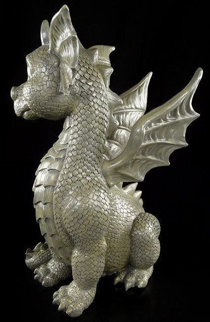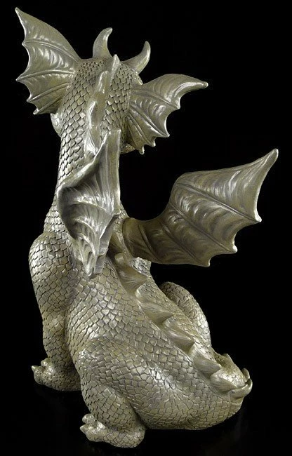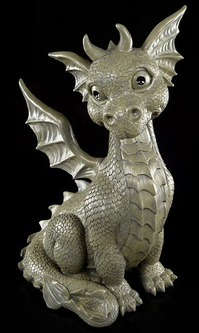 Mit geheimnisvollem Lächeln scheint die Drachendame den Betrachter direkt anzusehen. Dabei wirkt sie gar nicht gefährlich, sondern so niedlich, dass man ihr gar nicht widerstehen kann. Der sitzende Drache aus Kunststein (Polyresin) ist eine niedliche Deko für Drinnen und Draußen.