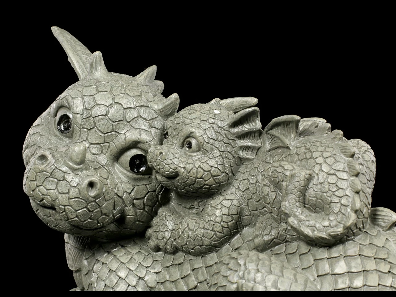 Die süße Drachen Garten Figur ist ein wundervolles Geschenk zum Einzug oder vielleicht auch zur Geburt eines Kindes. Die Drachen Mama lässt ihr Drachen Junges auf dem Rücken toben und freut sich mit ihm über den Sonnenschein. Die handbemalte Garten Figur aus Kunststein (Polyresin) wird Sie begeistern