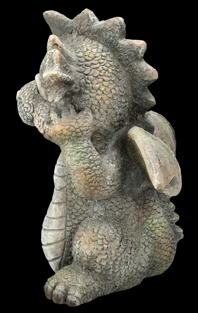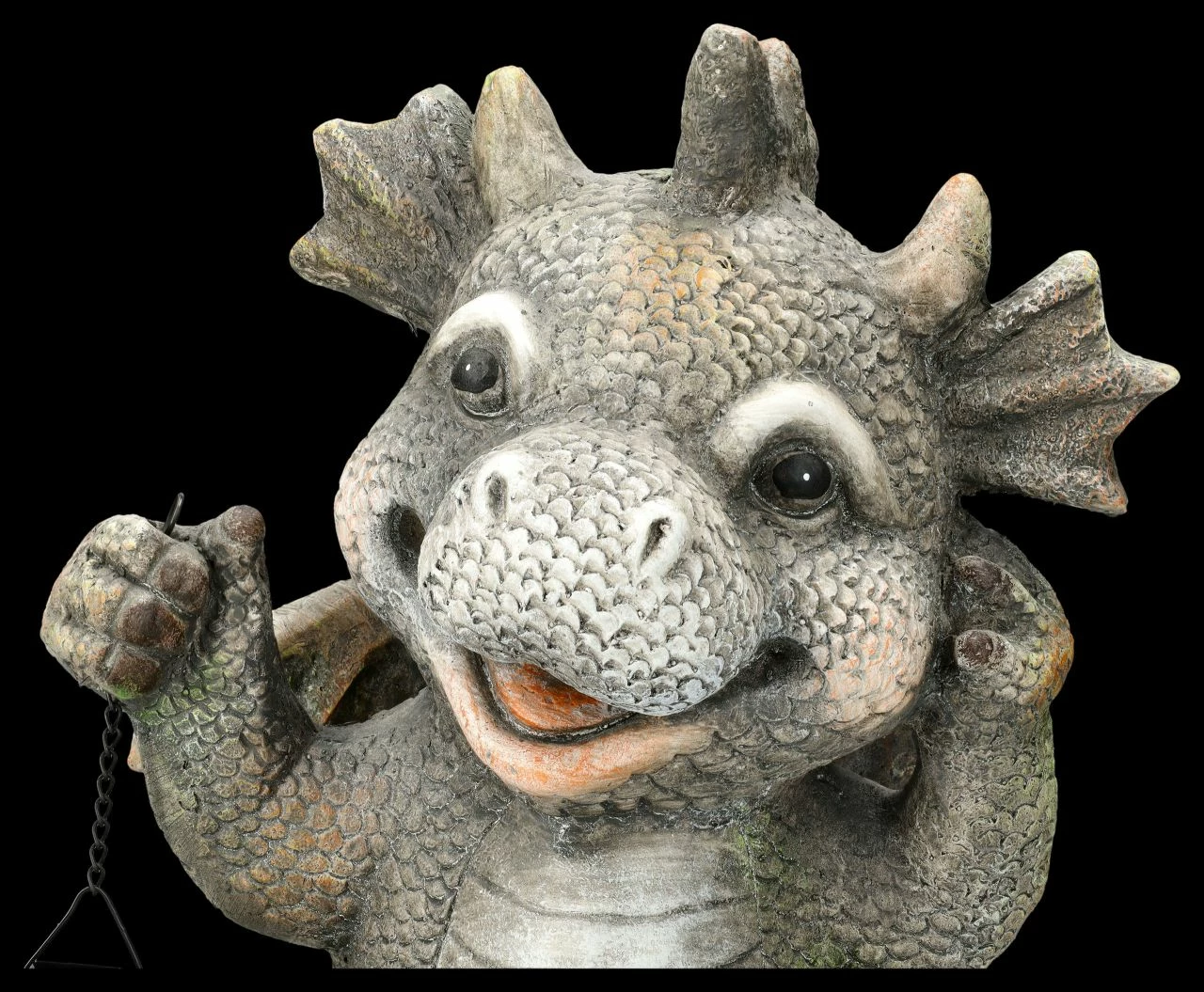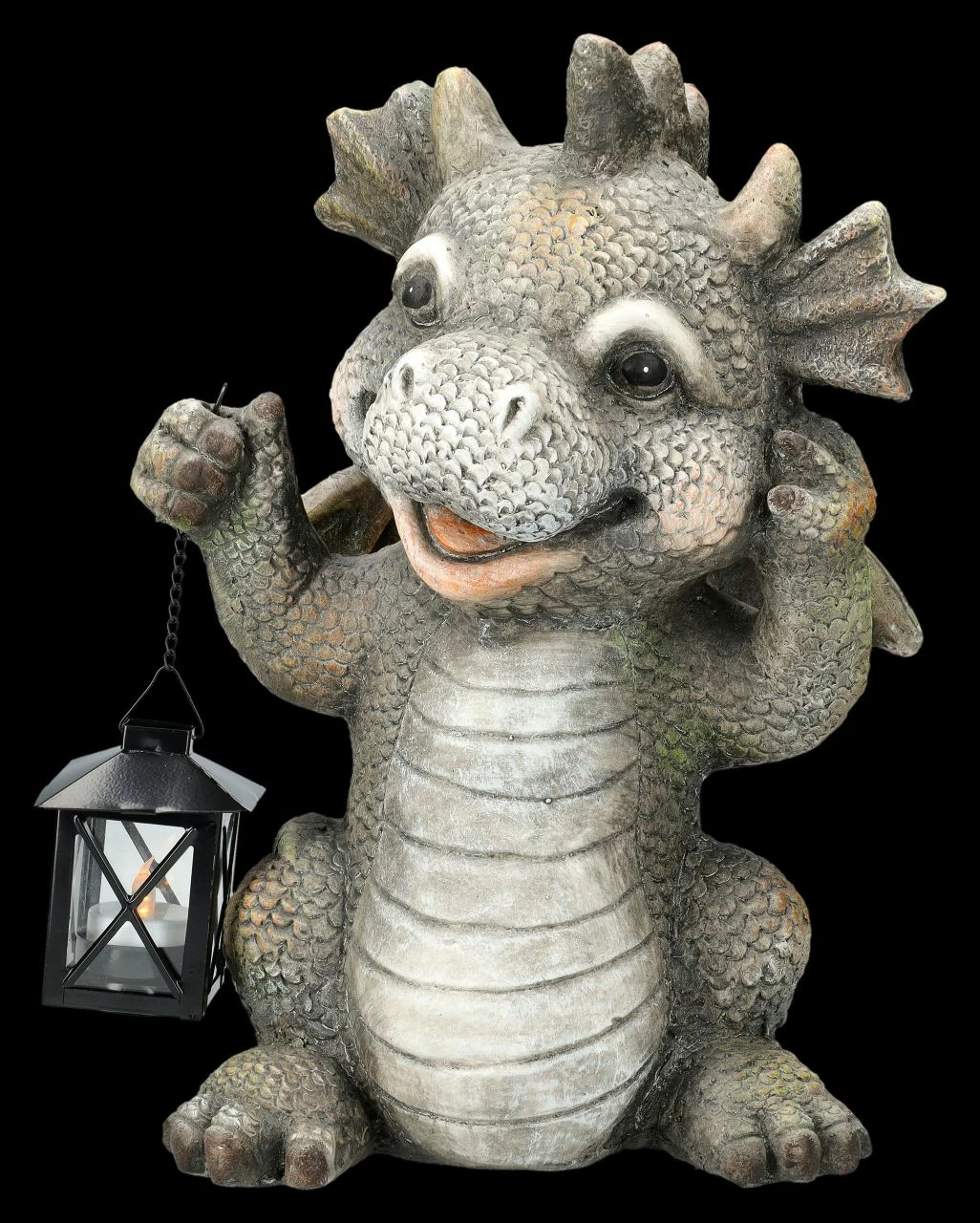 Mit seiner kleinen Laterne zeigt der niedliche Drache fröhlich den Weg zum Garten. In der Laterne kann ein Teelicht untergebracht werden, das jedoch nicht in der Lieferung enthalten ist. Dieser bezaubernde Drache als Gartenfigur ist aus liebevoll handbemaltem Kunststein (Polyresin). Er ist ein absoluter Blickfang, denn immerhin ist er 37 cm hoch, 31 cm breit und 22 cm tief.und kann nicht übersehen werden. Der niedliche Drache mit seiner Laterne steht am besten in einem geschützten Bereich am Eingang, so kann er alle Besucher fröhlich empfangen. Die niedliche Drachen-Figur ist zwar wetterbeständig, aber nicht frostsicher und daher empfiehlt der Hersteller, den kleinen Drachen im Winter frostsicher unterzubringen.