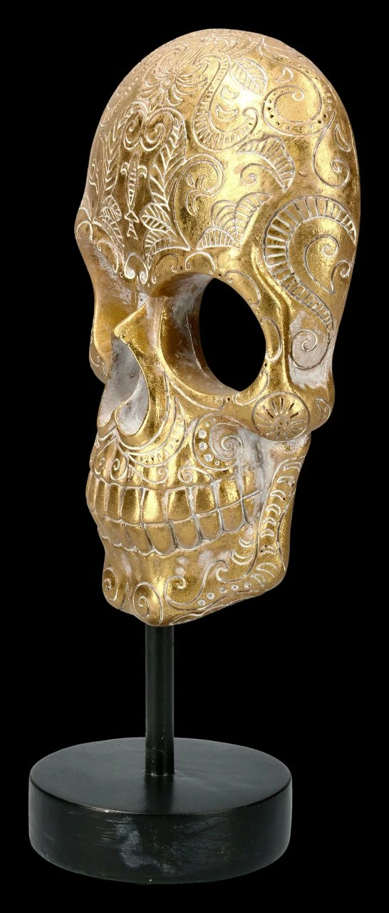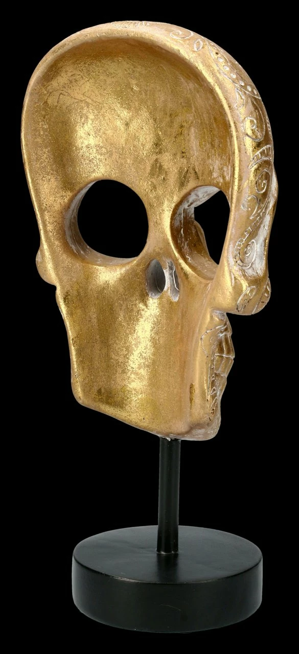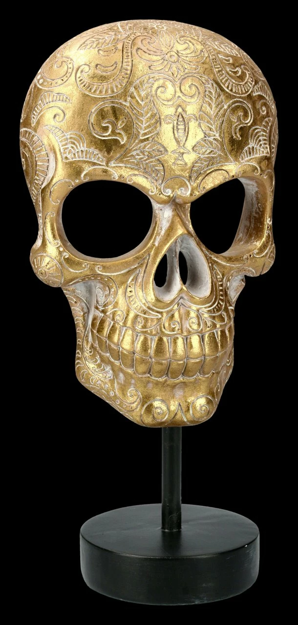 Außergewöhnlich und sehr dekorativ ist diese fantastische goldfarbene Totenkopf-Maske mit den schönen Ornamenten. Sie ist auf einem Metall Ständer befestigt. Der Metallständer mit dem Totenkopf ist insgesamt 29 cm hoch. Die Totenkopf-Maske hat die Höhe von 20 cm, eine Breite von 14 cm und eine Tiefe von 9,5 cm. Sie ist sehr detailreich aus Kunststein (Polyresin) gefertigt und mit großer Sorgfalt handbemalt. Diese fantastische Maske bringt Glanz auf Ihren Schreibtisch, oder in Ihr Regal und wird sicher alle Blicke Ihrer Besucher auf sich ziehen.