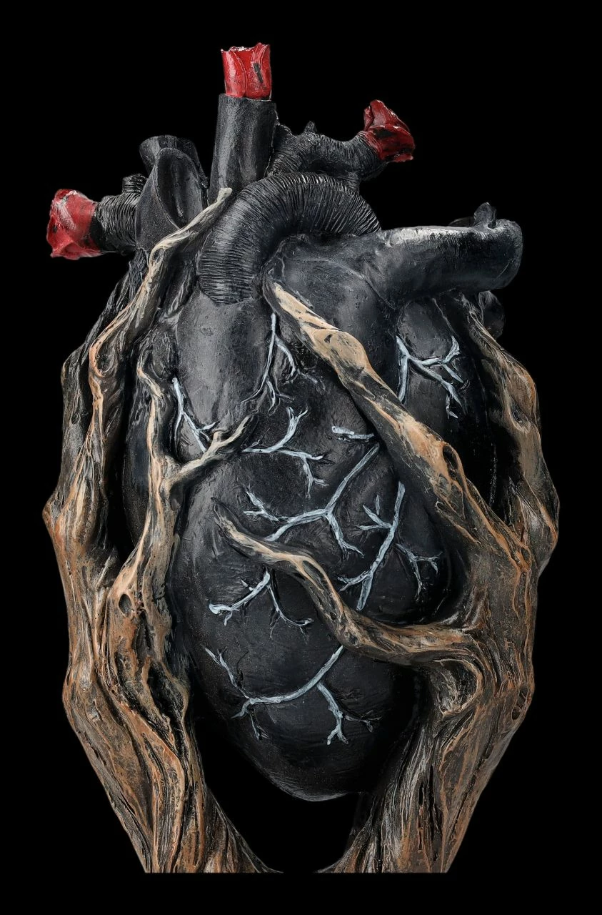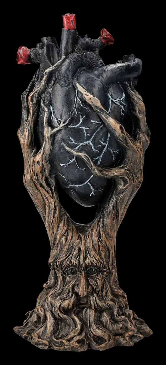 Der Gesichtsausdruck dieses wie aus einer uralten Wurzel blickenden Greenman wirkt ernst und eher traurig. Aber vielleicht kein Wunder, denn mit seinen nach oben gestreckten Händen hält er fest ein schwarzes Herz umschlungen. Will er damit sagen, dass dieses schwarze Herz niemandem mehr Böses antun kann? Eigentlich ist der Greenman ein Symbol für Sterben und Wiedergeburt – aber er ist auch ein Mahner und schützt als einer der Vegetationsgötter das Entstehen und Vergehen der gesamten Natur. Mit der Höhe von 33,5 cm, der Breite von 14 cm und der Tiefe von 12 cm ist die sorgfältig und detailreich aus handbemaltem Kunststein (Polyresin) gefertigte Greenman Figur mit dem schwarzen Herzen eine auffällige und faszinierende Deko.