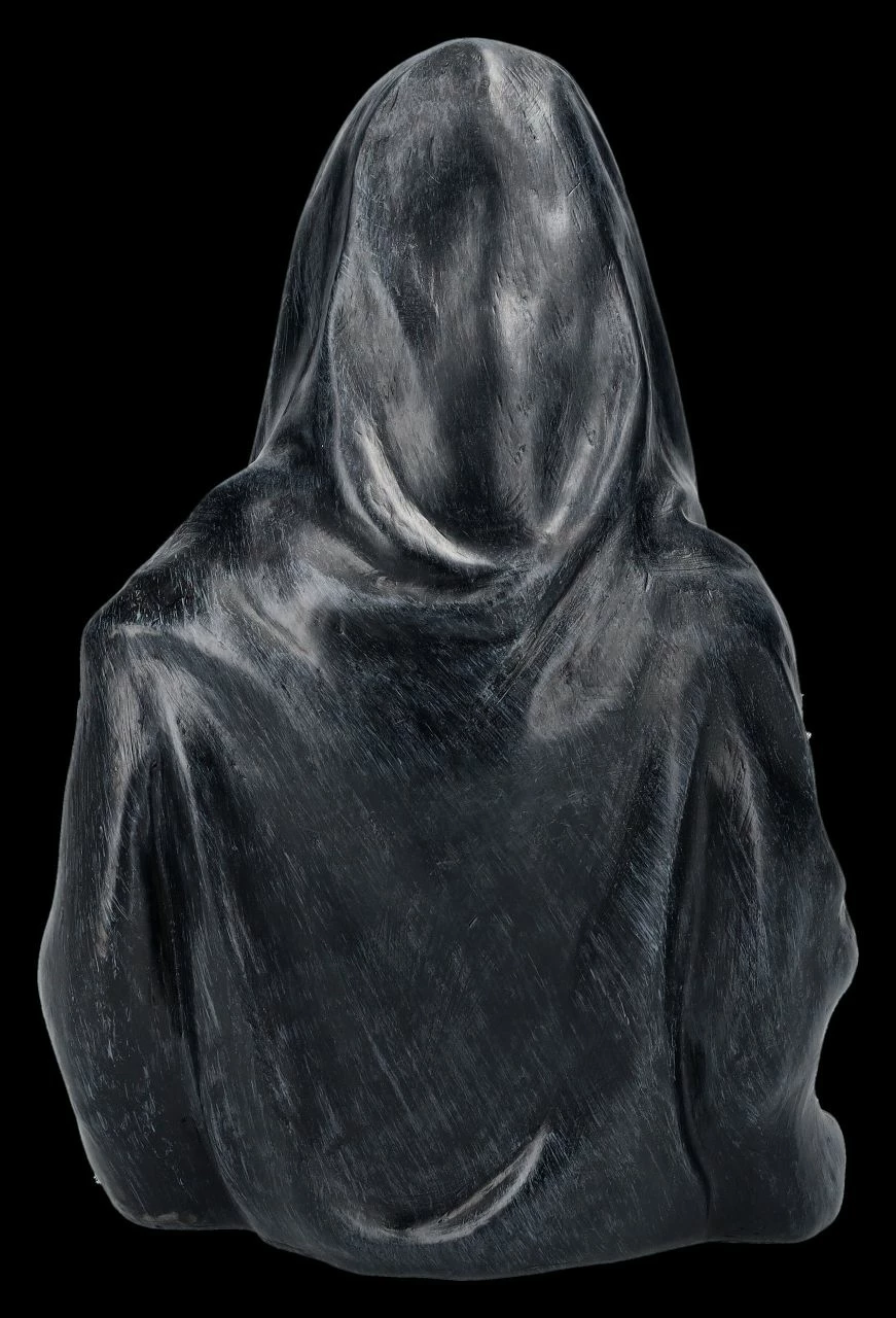 Kalte Schauer laufen sicher jedem über den Rücken, der diesen gruselig grinsenden Grim Reaper sieht, der die Lampe mit dem Lebenslicht in seinen knochigen Händen hält. Durch die batteriebetriebene LED-Beleuchtung mit Farbwechsler in der Glaslampe bekommt die 21,5 cm hohe, 14 cm breite und 11 cm tiefe Grim Reaper Büste aus handbemaltem Kunststein (Polyresin) einen zusätzlichen Gruseleffekt. Diese Sensenmann-Figur ‚Dein Ende naht‘ ist nicht nur für Halloween eine schauerliche Deko. Für die LED-Beleuchtung werden 3 x LR41 Batterien benötigt, die nicht in der Lieferung enthalten sind.