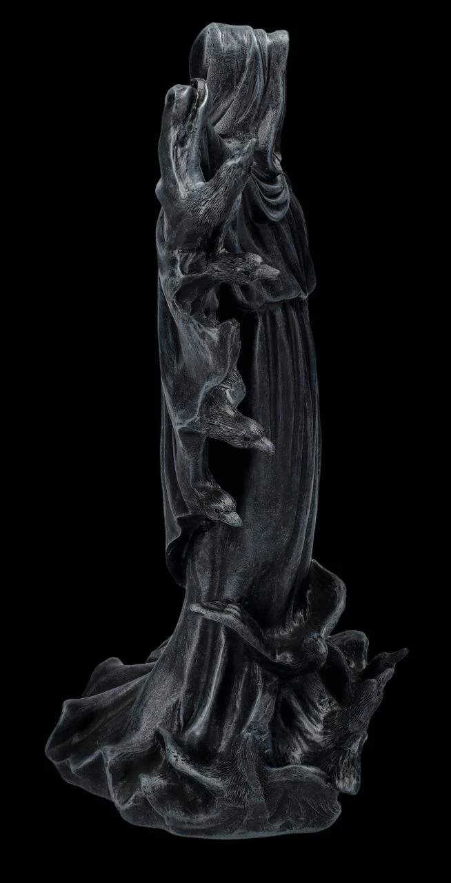 Mit weit ausgebreiteten und erhobenen Armen steht dieser Grim Reaper als Wächter der Raben ganz still da. Zahlreiche schwarze Raben scheinen sich aus seinem Umhang zu befreien und umflattern ihn. Beinahe kann man ihre krächzenden Rufe vernehmen. Die 28 cm hohe, 23 cm breite und 14 cm tiefe Grim Reaper-Figur ist sehr detailreich aus handbemaltem Kunststein (Polyresin) gefertigt. Der Wächter der Raben ist auch ein faszinierendes Accessoire für jeden düsteren Altar.