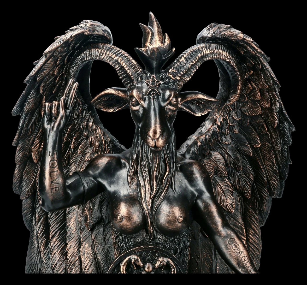 Wahrlich beeindruckend ist diese kupferfarben handbemalte Baphomet-Figur aus hochwertigem Kunststein (Polyresin). Der französische Diakon, Schriftsteller und Okkultist Alphonse Louis Constant – besser bekannt unter seinem Künstlernamen Éliphas Lévi Zahed – gilt seit seinem Werk zur Dunklen Magie als Wegbereiter des modernen Okkultismus. Darin beschrieb er Baphomet als Symbol des Gleichgewichts der Gegensätze: Also halb Mensch, halb Tier – halb männlich, halb weiblich – halb gut, halb böse – halb Engel, halb Satan etc. Baphomet war die Gottheit, die angeblich von den Templern angebetet wurde, was als Hauptgrund für die Inquisition der Tempelritter angeführt wurde. Später wurde Baphomet in die okkulten und mystischen Rituale aufgenommen. Den rechten Arm mit dem lateinischen Wort ‚Solve‘, also ‚Auflösen‘, hält diese wunderbare Darstellung der ‚Sabbatical Goat‘ mit dem magischen Segen nach oben und den linken Arm mit der Aufschrift ‚Coagula‘ einladend nach unten. Die detailreiche, 40 cm hohe 32 cm breite und 22 cm tiefe Baphomet-Figur wird mit Sicherheit jeden faszinieren.