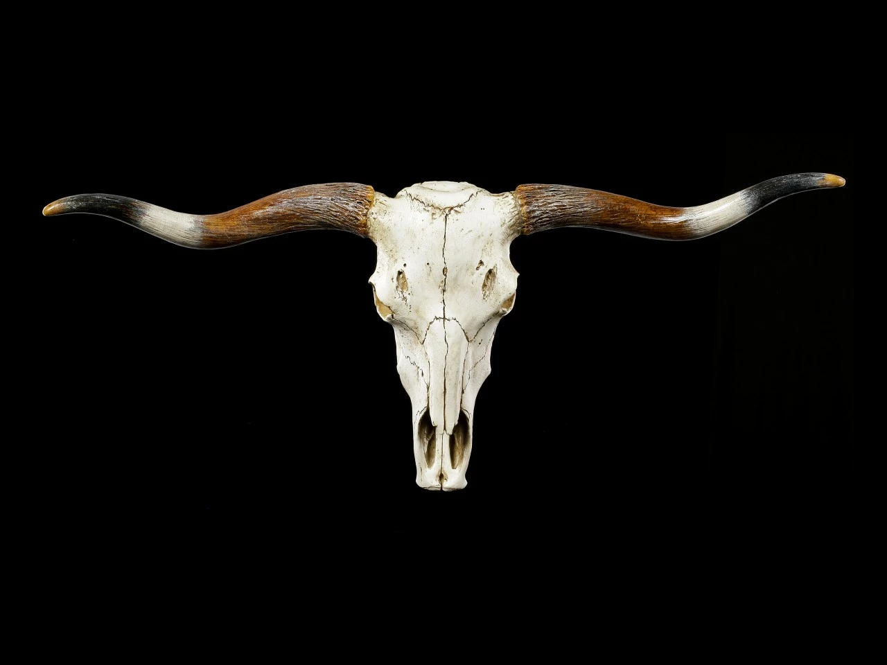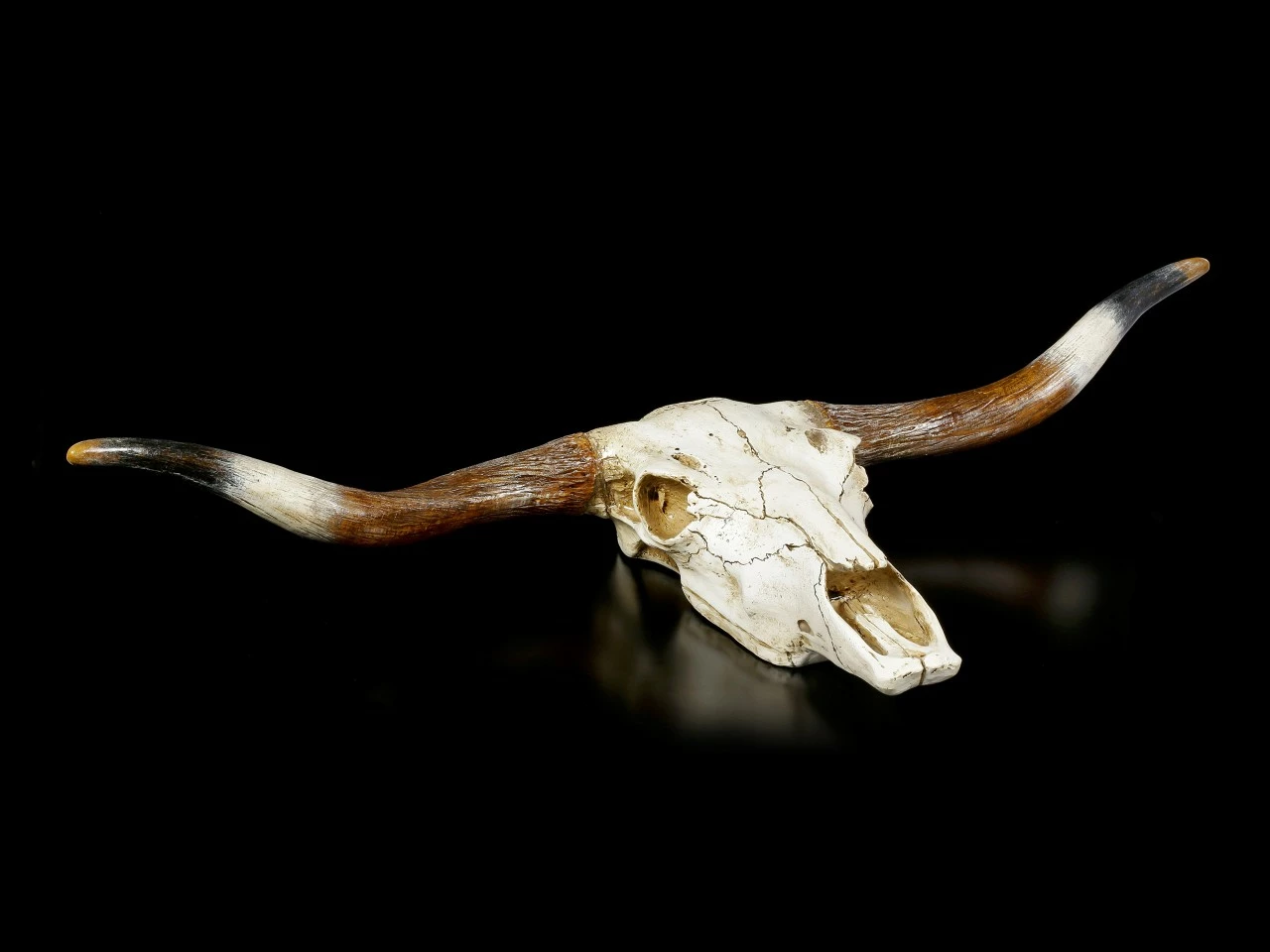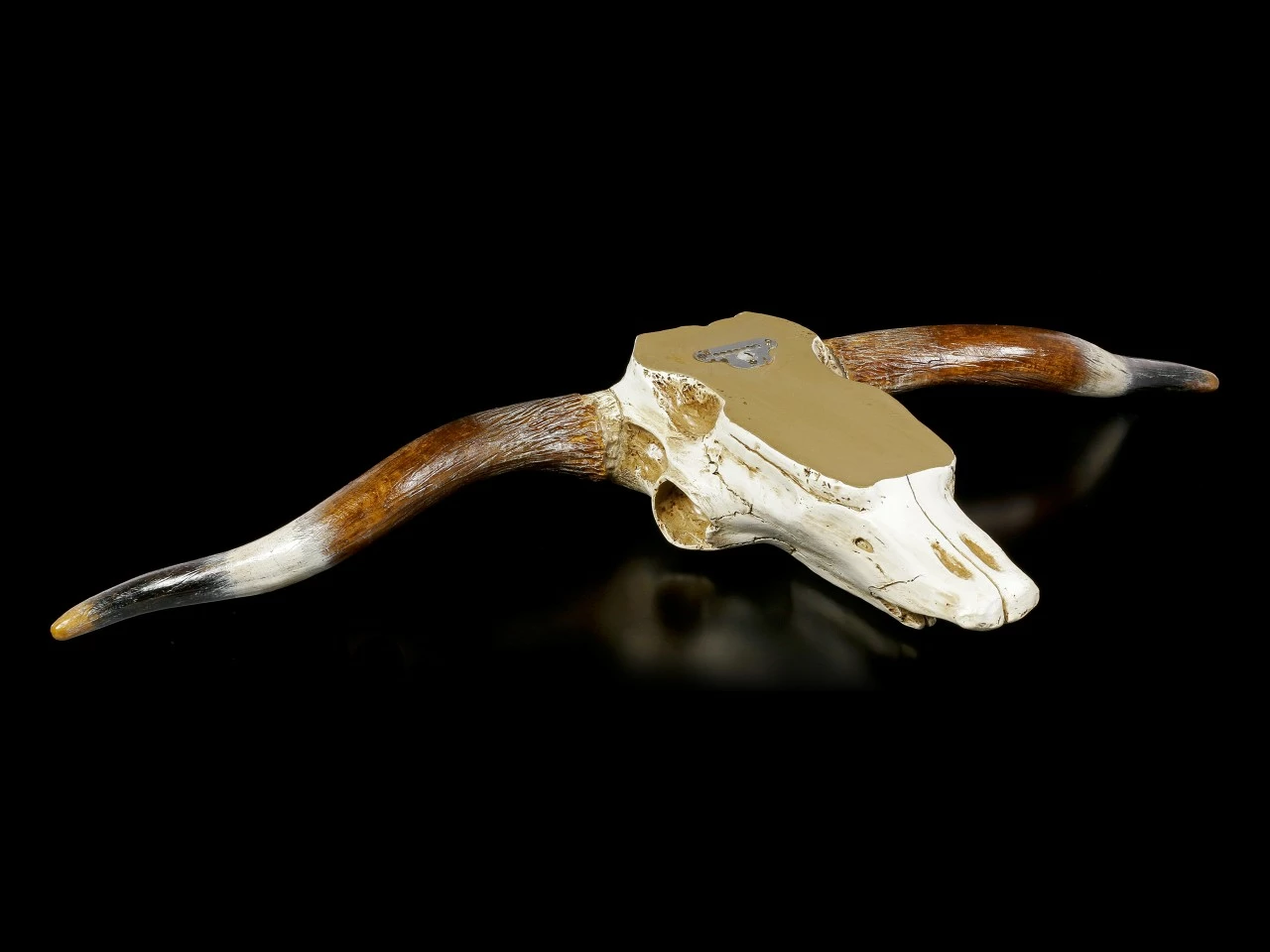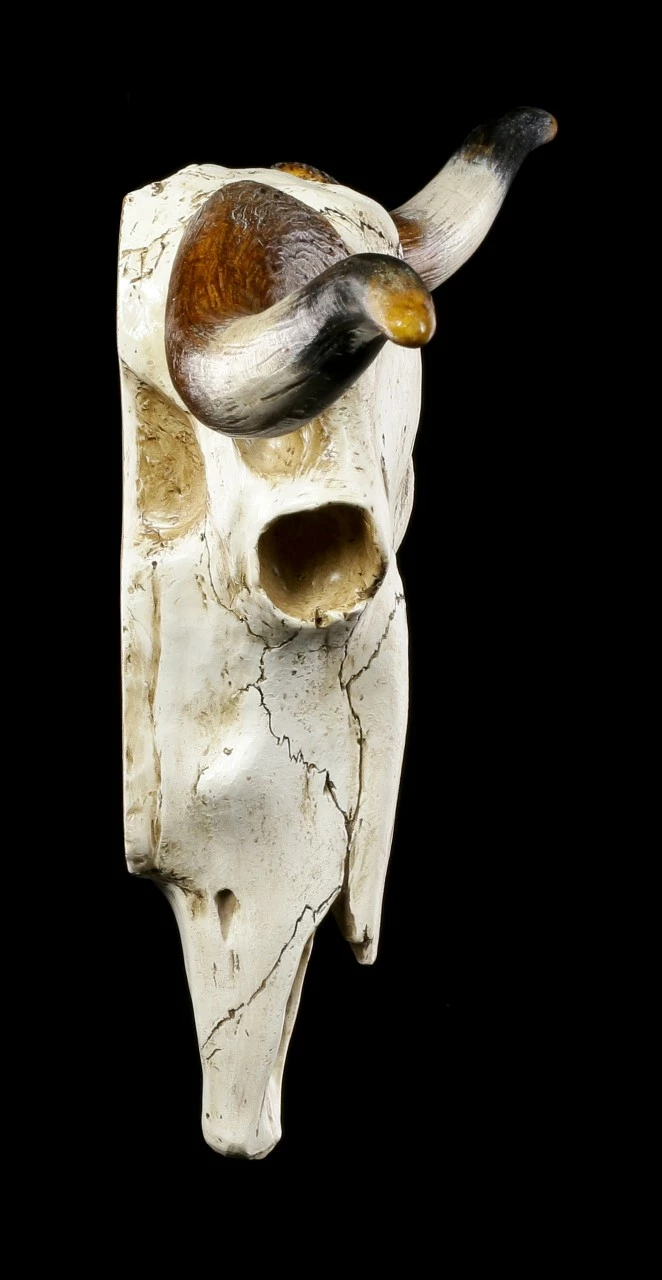 Der handbemalte Büffel Schädel aus hochwertigem Kunststein (Polyresin) mit den langen geschwungenen Hörnern wirkt überaus realistisch. Nicht nur für jeden Western Fan ist dieser dekorative Schädel eine fantastische Wanddeko. Das 36 cm hohe, mit den Hörnern 88,5 cm breite und 14 cm tiefe Wandrelief besticht durch die vielen Details. Dieser fantastische Büffelschädel wird auch in jedem Westernsaloon zum sofortigen Blickfang.