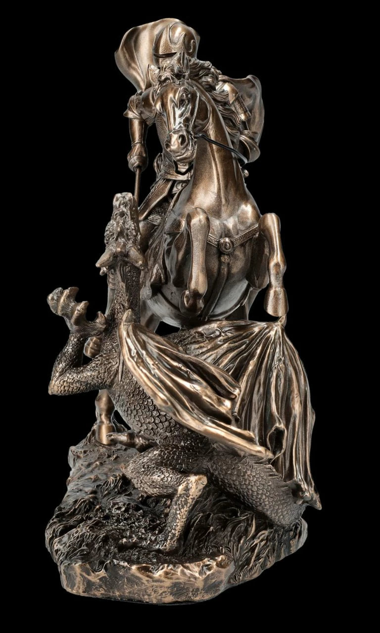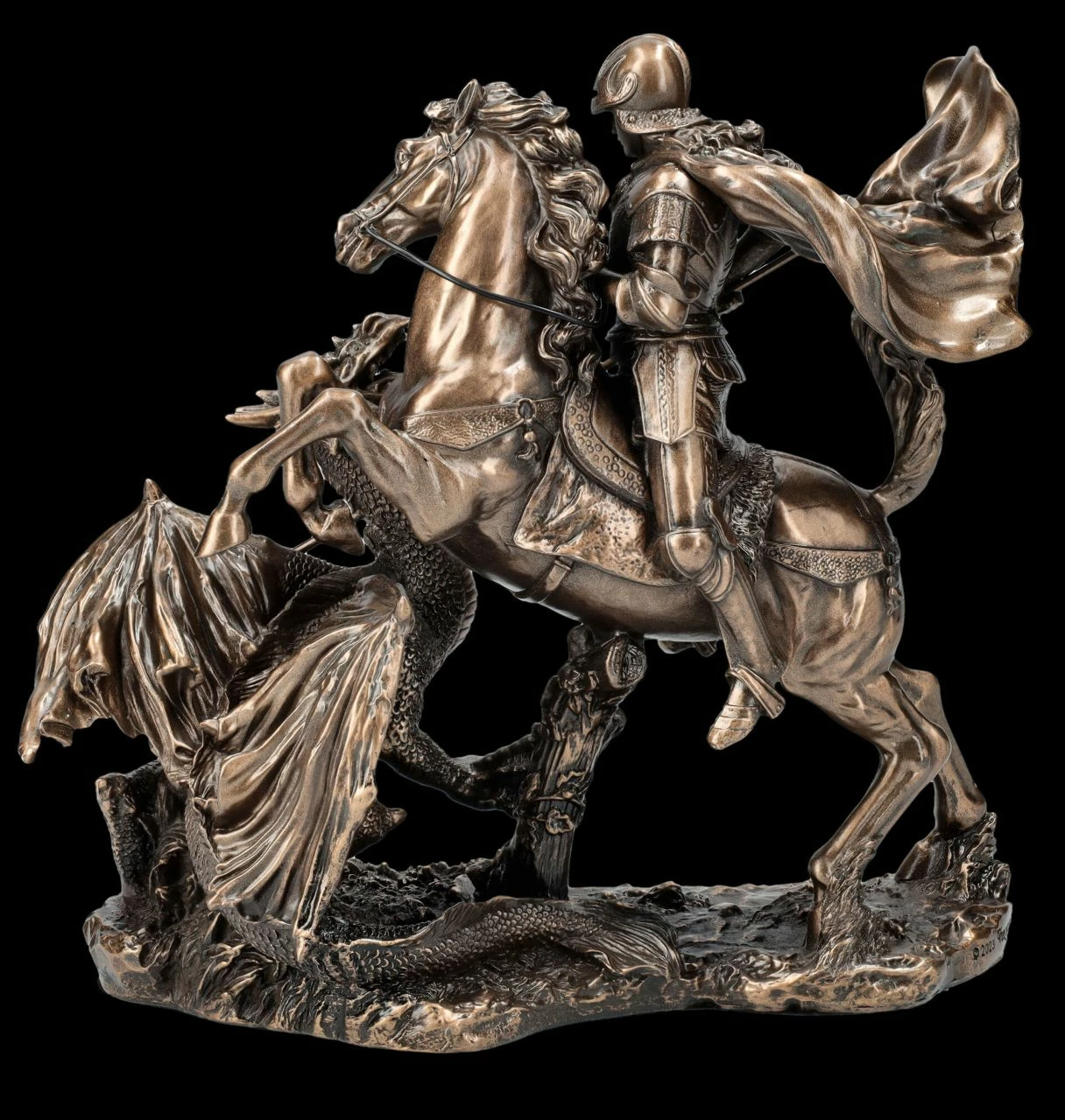 Um den Heiligen Georg, der Soldat im römischen Heer war und mit dem Drachen kämpfte, um die Tochter des lybischen Königs zu retten, die geopfert werden sollte, ranken sich zahlreiche Mythen. Heute gehört der beliebte Heilige Georg zu den 14 Nothelfern. Der Mut Georgs beim Kampf gegen den wütenden Drachen hat Veronese bei dieser prächtigen Skulptur wunderbar eingefangen. Der detailreiche Drache, das sich aufbäumende Pferd und schließlich Georg in seiner römischen Rüstung mit dem Speer in der Hand ist außerordentlich effektvoll. Die 16 cm hohe, 16,5 cm breite und 8 cm tiefe Kunststein (Polyresin) Skulptur aus der Studio Collection von Veronese ist sehr aufwändig bronziert und coloriert und wirkt sehr kunstvoll. Die beeindruckende Figur des Drachentöters auf seinem Pferd ist – vor allem auch für jeden Georg – ein großartiges Geschenk.