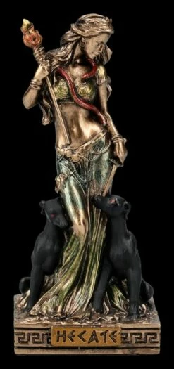 Seit uralten Zeiten wird der Mondgöttin nicht nur im alten Griechenland, sondern in allen Kulturen gehuldigt. Im alten Griechenland ist es Hekate, die auch als Göttin der Magie und der Übergänge verehrt wurde. Die Göttin aus der Studio Collection von Veronese aus Kunststein (Polyresin) wird von zwei schwarzen Hunden begleitet, die sich zärtlich an ihre Beine schmiegen. Um den Hals der Hekate windet sich eine Schlange und in der rechten Hand trägt sie ihren magischen Stab..Die wunderbare kleine Figur besticht durch die edle Bronzierung und fein abgestimmte Colorierung. Die kleine Mondgöttin mit den beiden Hunden ist 8,5 cm hoch, 4 cm breit und 4 cm tief und nicht nur für Wicca Rituale, sondern für alle, die sich dem Urweiblichen der Göttin verbunden fühlen, ein perfektes Geschenk.