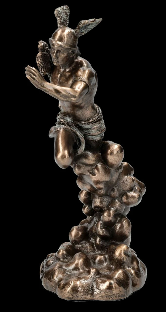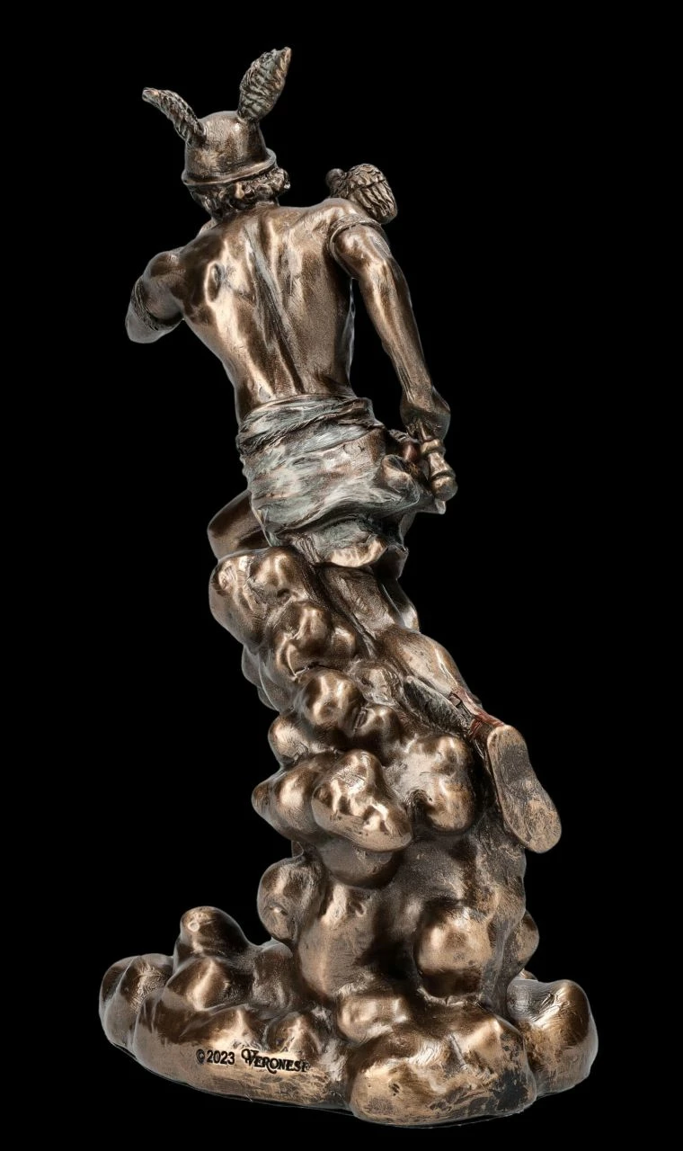 In der griechischen Mythologie war Hermes als Sohn Zeus dessen Bote. Er war aber auch das Symbol für den Wohlstand und war Beschützer der Reisenden, der Händler – und seltsamerweise – auch der Diebe und wurde meist als Jüngling mit geflügeltem Helm und Flügeln auf den Schultern und den Schuhen dargestellt. Ein wichtiges Attribut war auch – wie bei dieser wunderbaren Hermes-Skulptur aus der Studio Collection von Veronese, der mächtige goldene Zauberstab oder auch Hermesstab. Die faszinierende und detailreiche Skulptur aus der Götter-Serie aus unserem Shop ist aus Kunststein (Polyresin) und wurde sorgfältig bronziert und sehr fein coloriert. Sie ist 15,5 cm hoch, 10 cm breit und 6 cm tief und wirkt sehr edel. Diese Figur des Griechischen Götterboten ist nicht nur ein effektvoller Blickfang, sondern auch ein perfektes Geschenk für Sammler und für alle die sich für die Götterwelt interessieren.