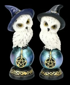 Wären die Hexenhüte nicht zu sehen, würde man bei dem unschuldigen Blick dieser beiden niedlichen Schneeeulen, die auf einer mit Pentagramm verzierten Kugel Platz genommen haben, wohl nicht vermuten, dass es sich um Hexen-Eulen handelt. Die Kugeln ruhen auf einem Sockel, der mit einer keltischen Bordüre verziert ist. Die 13 cm hohen, 4,5 cm breiten und 4,5 cm tiefen Eulenfiguren im 2er Set sind liebevoll aus handbemaltem Kunststein (Polyresin) gefertigt. Sie sind eine hübsche Deko, aber auch – nicht nur für Hexen oder Eulen-Fans – ein bezauberndes Geschenk.
